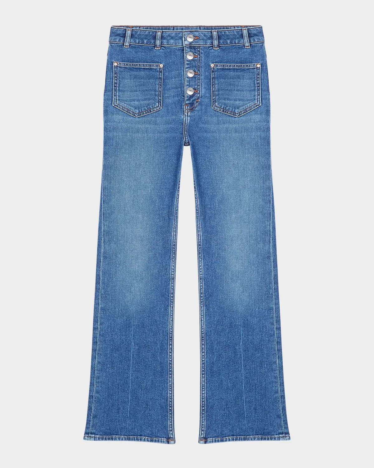 Maje "Passiony" jeans in slightly faded denim accented with the brand's signature clover metal rivets High rise Fourpocket style Full length Straight legs Fourbutton fly; belt loops Cotton/elastane Unlined Machine wash cold Imported