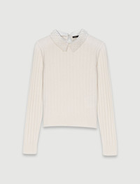 Pearl-collar ribbed jumper The collection reinterprets city style with pieces that are both structured and refined. This short, fitted knit jumper transforms throughout the day thanks to a removable Peter Pan collar, fully embroidered with pearlescent beads, or can be worn for a more minimalist look with a simple round neck. The refined details, like the delicate back fastening and ribbed trim, make all the difference. Wear it with grey flared jeans and a Miss M bag for a contrast between sophistication and urban casualness. - Short and fitted cut - Removable Peter Pan collar embroidered with beads - Buttoned teardrop opening at the back - Ribbed cuffs and hem The model is 5' 10 and wears a size FR 1. Reference: MFPPU00981_0101 Composition & care Main material: 94% wool, 5% polyamide, 1% elastane Removable collar: 94% polyester, 6% elastane Rib: 82% wool, 15% polyamide, 3% elastane Hand wash Do not bleach Do not tumble dry Iron at a maximum temperature of 110°C without steam Do not dry clean