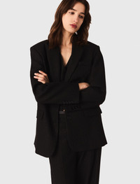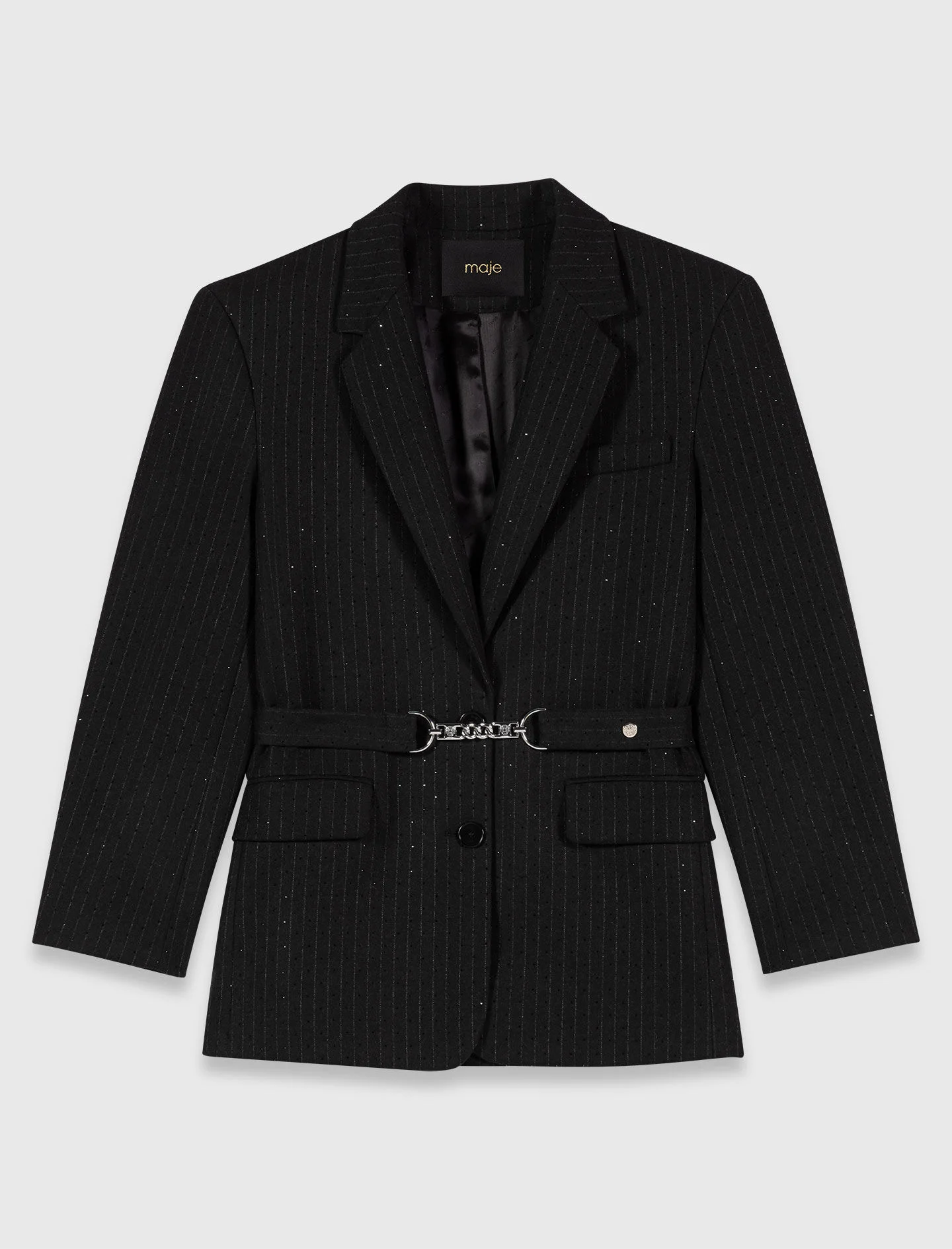Rhinestone suit jacket The night comes alive, silhouettes sparkle and take centre stage. Maje unveils pieces designed to shine after dark. Combining confident tailoring with subtle shimmer, this long-sleeved jacket is a new take on the classic suit. Fine rhinestone pinstripes add a precious touch, while its fitted cut enhances the figure. A removable belt and pockets add a practical touch.Create a total look by pairing it with the matching waistcoat and trousers, rhinestone mesh court shoes and a mini bag for a chic and radiant outfit. - Rhinestone suit jacket - Removable belt - Button fastening The model is 5' 10 and wears a size 36. Reference: MFPVE00729_2517 Composition & care Main material: 64% polyester, 34% viscose, 2% elastane Lining: 100% viscose Do not wash Do not bleach Do not tumble dry Iron at a maximum temperature of 110°C without steam F/ - Professional dry clean, with hydrocarbon solvent, gentle treatment