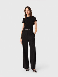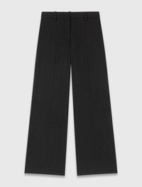 Rhinestone suit trousers This season, bold black pieces and precious accessories are enhancing every silhouette with radiance, intensity and refinement. Suit trousers, revisited with a touch of sparkle. Adorned with fine stripes highlighted by subtle rhinestones, they play on the contrast between masculine and feminine. Their wide cut elongates the figure, while the belt loops and discreet fastening define the waist. Pair with a close-fitting T-shirt, a belt and transparent rhinestone heels for an elegant and assertive look. - Striped suit trousers - Discreet rhinestone details - Belt loops at the waist - Zip and hook fastening - Wide, flowing fit - Designed for a standard fit The model is 5' 10 and wears a size 36. Reference: MFPPA00745_2517 Composition & care Main material: 64% polyester, 34% viscose, 2% elastane Pocket lining: 100% viscose Do not wash Do not bleach Do not tumble dry Iron at a maximum temperature of 110°C without steam F/ - Professional dry clean, with hydrocarbon solvent, gentle treatment