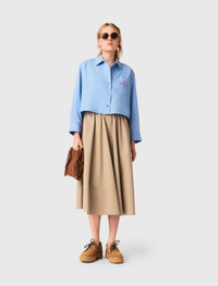 Pleated back embroidered shirt A new take on nautical style, the Maje woman embraces a dynamic, preppy look, featuring a graphic touch inspired by the Yacht Club. This short, loose-fitting shirt features gold press-studs, long sleeves with dropped shoulders and a pleated back that adds movement and structure to the silhouette. A red Maje Yacht Club embroidery and a nautical anchor on the chest pocket add sophisticated details to the piece. Wear it with a midi skirt for a graphic touch, and team it with loafers and a suede M bag for a sporty-chic feel. - Cropped boxy shirt - Structured pleated back - Round gold buttons - Red Maje Yacht Club embroidery on the pocket - Long sleeves with dropped shoulders Reference: MFPCM00722_0201 Composition & care Main material: 81% polyester, 19% cotton Embroidery: 100% polyester Regular cycle 30° Do not bleach Do not tumble dry Iron at a maximum temperature of 110°C without steam F/ - Professional dry clean, with hydrocarbon solvent, gentle treatment