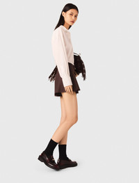 Pleated skort This skort perfectly embodies the Maje preppy look with a twist. Its 2-in-1 design combines comfort and style, thanks to a contrasting elasticated waist and a slim belt punctuated with the signature Clover. The crisp pleats structure the volume for a confident silhouette. Wear it with an embroidered-collar shirt or a close-fitting knit to accentuate the chic college vibe, and complete the look with patent loafers and a textured bag for a retro metropolitan touch. - Pleated 2-in-1 skort - Contrasting elasticated waist with a slim Clover-buckle belt - Short, structured cut with regular pleats - Zip fastening at the back - Designed for a standard fit The model is 5' 11 and wears a size 36. Reference: MFPSH00694_G005 Composition & care Main material: 52% polyester, 26% wool, 18% viscose, 4% elastane Lining: 100% viscose Inner fabric: 100% polyester Do not wash Do not bleach Do not tumble dry Iron at a maximum temperature of 110°C without steam F/ - Professional dry clean, with hydrocarbon solvent, gentle treatment