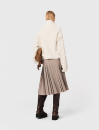 Pleated checked midi skirt The season is built around structured, radiant silhouettes, where classic styles are revisited with exquisite details. An interplay of volumes is combined with sophisticated finishes to create strong, assertive pieces. This pleated houndstooth skirt stands out with the subtle sparkle of its rhinestones and its leather-effect buckles. The structured cut and floaty drape enhance its elegant, metropolitan look. Create a contrasting look by pairing it with a fringed turtleneck jumper, biker boots and a Miss M bag for a look that is both elegant and bold. - Houndstooth skirt - Rhinestone details and pleats - Leather-effect buckles on the front - Designed for a standard fit The model is 5' 10 and wears a size 36. Reference: MFPJU01555_G005 Composition & care Main material: 79% polyester, 19% viscose, 2% elastane Hand wash Do not bleach Do not tumble dry Iron at a maximum temperature of 110°C without steam F/ - Professional dry clean, with hydrocarbon solvent, gentle treatment