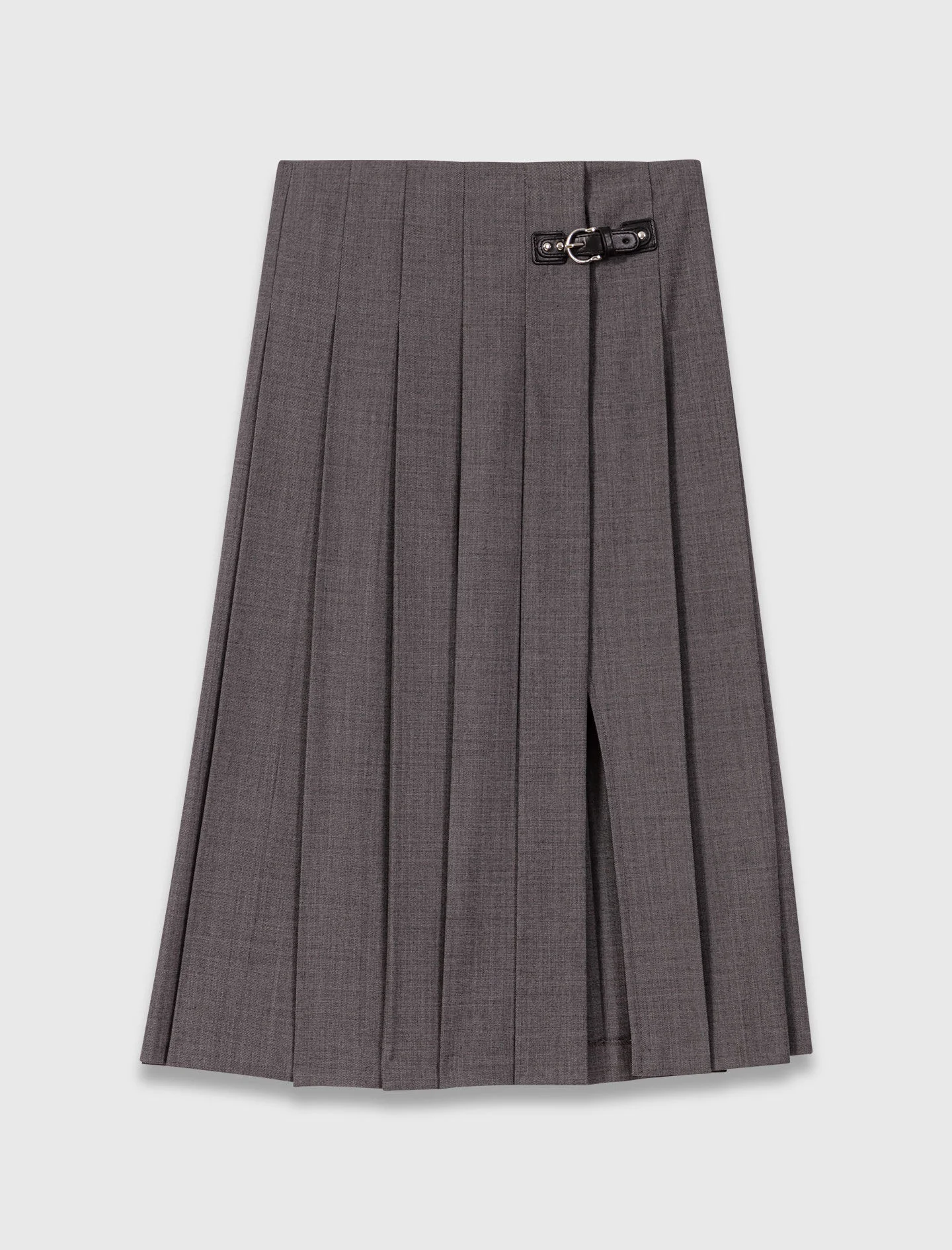 Long pleated skirt Structured volume, tailoring details and elaborate finishes: this season, Maje is stylishly reinventing the wardrobe. This long wool skirt subtly plays on layering, and is the key piece in the collection. Its pronounced pleats accentuate a confident silhouette, while the contrasting waist and side slit add a contemporary touch. Pair it with a turtleneck jumper, a signature bag, and be bold with sandals paired with a pair of socks. - Long pleated wool skirt - Contrasting 2-in-1 effect waist - Buckle tab and rounded slit - Side hook fastening - Designed for a standard fit The model is 5' 10 and wears a size 36. Reference: MFPJU01539_0505 Composition & care Main material: 53% polyester, 26% virgin wool, 17% viscose, 4% elastane Belt: 100% cotton Inner fabric: 100% cotton Hand wash Do not bleach Do not tumble dry Iron at a maximum temperature of 110°C without steam F/ - Professional dry clean, with hydrocarbon solvent, gentle treatment
