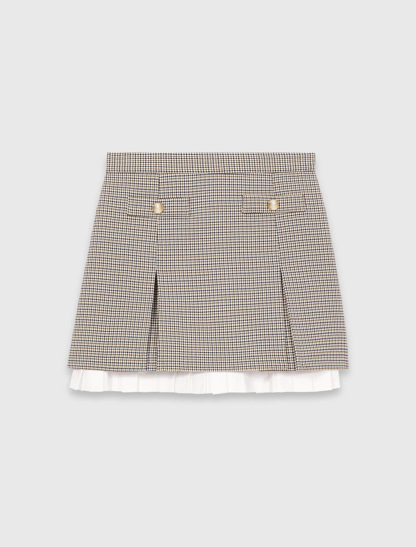 Pleated skirt with poplin details The Maje woman asserts herself with a modern look, navigating between a tailored feel and preppy chic influences. A real statement piece, this miniskirt features a houndstooth pattern enhanced by a white pleated ruffle in cotton poplin, playing on contrasting textures and layering. The box pleats give the silhouette structure, while the two pocket flaps embellished with gold buttons add a precious, unique touch to this short, graphic design. Wear it with a blue shirt layered over a knit jumper, boat shoes and a mini Miss M for a contemporary, preppy look. - Pleated skirt with a graphic houndstooth pattern - Contrasting pleated band in cotton poplin - Two box pleats on the front - Pocket flaps with gold buttons - Short A-line cut - True to size The model is 5' 10 and wears a size FR 36. Reference: MFPJU01577_U017 Composition & care Main material: 85% polyester, 10% viscose, 5% elastane Braid: 100% cotton Skirt lining: 100% viscose Inner fabric: 100% polyester Do not wash Do not bleach Do not tumble dry Iron at a maximum temperature of 110°C without steam F/ - Professional dry clean, with hydrocarbon solvent, gentle treatment