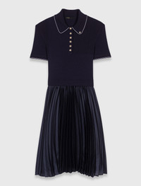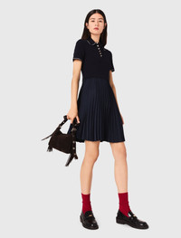 Mini pleated polo collar dress The collection plays on contrasts of materials and volumes to offer pieces with a sculpted look. This short bi-material dress combines a structured top with a buttoned polo collar and a more fluid skirt for a silhouette that naturally defines the waist. Wear with leather loafers and a signature bag to complete the look. - Short bi-material dress with short sleeves - Buttoned polo collar - Flowy skirt - Designed for a standard fit - The collection plays on contrasts of materials and volumes to offer pieces with a sculpted look. - This short bi-material dress combines a structured top with a buttoned polo collar and a more fluid skirt for a silhouette that naturally defines the waist. - Wear with leather loafers and a signature bag to complete the look. The model is 5' 10 and wears a size 36. Reference: MFPRO04342_0103 Composition & care Top: 56% viscose, 43% polyamide, 1% elastane Bottom: 71% polyester, 29% elastomultiester Rib: 60% viscose, 39% polyamide, 1% elastane Hand wash Do not bleach Do not tumble dry Iron at a maximum temperature of 110°C without steam Do not dry clean