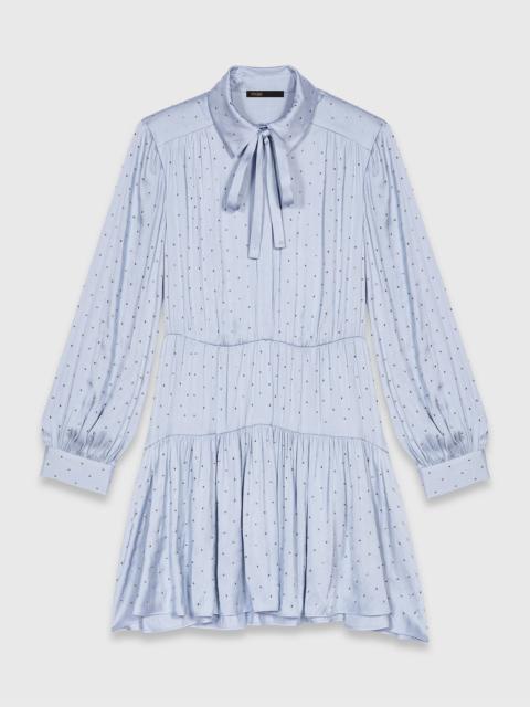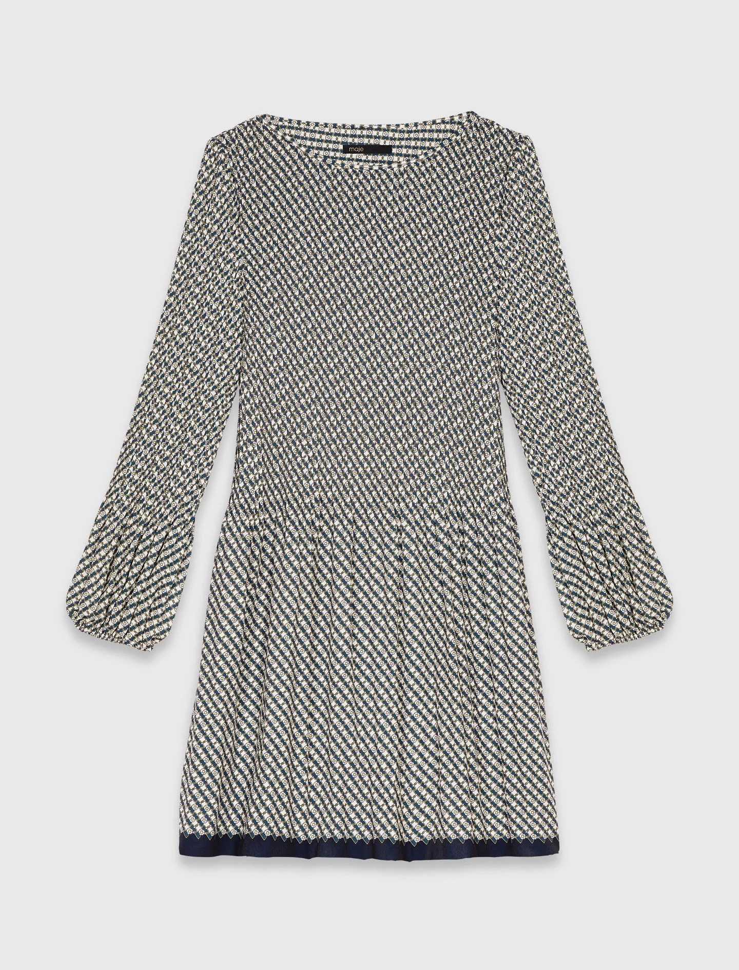 Patterned pleated dress The collection invites a light and graphic femininity, driven by plays on volume and signature prints. Fully pleated, this chiffon dress with a bow print features a smocked top and wide sleeves that add rhythm to the silhouette. With a round neck adorned with a contrasting trim at the bottom, it is easily accessorised with the collection's key pieces: a jewellery belt and leather loafers. - Printed chiffon pleated dress - Round neck and voluminous long sleeves - Smocked effect on top and contrasting trim at the bottom - Designed for a standard fit The model is 5' 10 and wears a size 36. Reference: MFPRO04343_L029 Composition & care Main material: 100% polyester Hand wash Do not bleach Do not tumble dry Do not iron F/ - Professional dry clean, with hydrocarbon solvent, gentle treatment