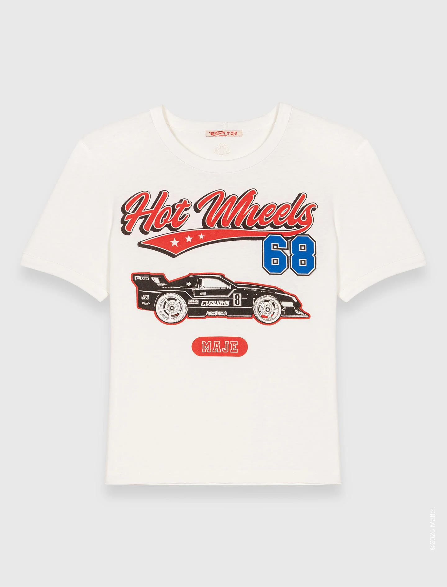 Printed T-shirt Hot Wheels™ x Maje This summer, Maje is teaming up with Hot Wheels™, the iconic miniature car brand and pop culture phenomenon. Parisian elegance meets racetrack energy in a collection of assertive femininity, where wardrobe essentials are inspired by motorsport themes to instil a new attitude. Featuring a signature flame print on the front, this round-neck, short-sleeved T-shirt features Clover embroidery on the back. A must-have piece from the most vibrant collab' of the summer. - Hot Wheels™ x Maje T-shirt - Short-sleeved and round-neck - Printed flames on front - Clover embroidery on back - Designed for a standard fit The model is 5' 9 and wears a size 1. Reference: MFPTS00967_10 Composition & care Main material: 100% cotton Embroidery: 100% polyester Regular cycle 30° Do not bleach Do not tumble dry Iron at a maximum temperature of 110°C without steam F - Professional dry clean, with hydrocarbon solvent, normal treatment