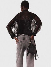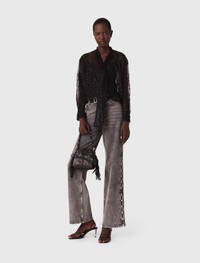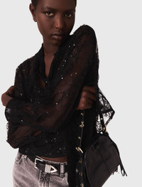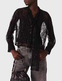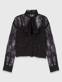 Lace pussy bow shirt This new season, Maje is reinventing the wardrobe with characterful pieces in unexpected materials. Discover a piece of bold elegance, designed to shine throughout the seasons. This lightweight shirt plays on the contrast between the sheerness of the lace and the discreet sparkle of the sequins. Wear it alone or layered, to add a twist to your denim or make an evening outfit shine, and finish the look with signature accessories: a fringed bag, a leather belt and mirror-heeled sandals. - Sheer sequinned lace pussy-bow shirt - Removable camisole - Long sleeves and a tie-neck pussy-bow collar - Designed for a standard fit The model is 5' 10 and wears a size 1. Reference: MFPCM00698_2517 Composition & care Main material: 100% polyamide Lining: 85% polyester, 15% elastane Hand wash Do not bleach Do not tumble dry Do not iron F/ - Professional dry clean, with hydrocarbon solvent, gentle treatment