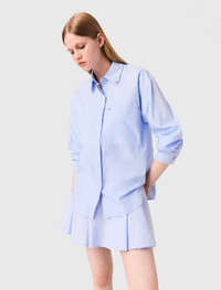 Long poplin blouse This poplin shirt gives a twist to a wardrobe essential with its Clover jewellery buttons. Its straight cut is highlighted by a box pleat on the back, a chest pocket and classic details subtly reimagined. - Poplin shirt - Clover jewellery buttons - Shirt collar and long sleeves - Button fastening - Chest patch pocket - Box pleat on back - Designed for an oversized fit The model is 5' 10 and wears a size 1. Reference: MFPCM00684_2507 Composition & care Main material: 100% cotton Normal cycle 30° Do not bleach Do not tumble dry Iron at a maximum temperature of 150°C F - Professional dry clean, with hydrocarbon solvent, normal treatment