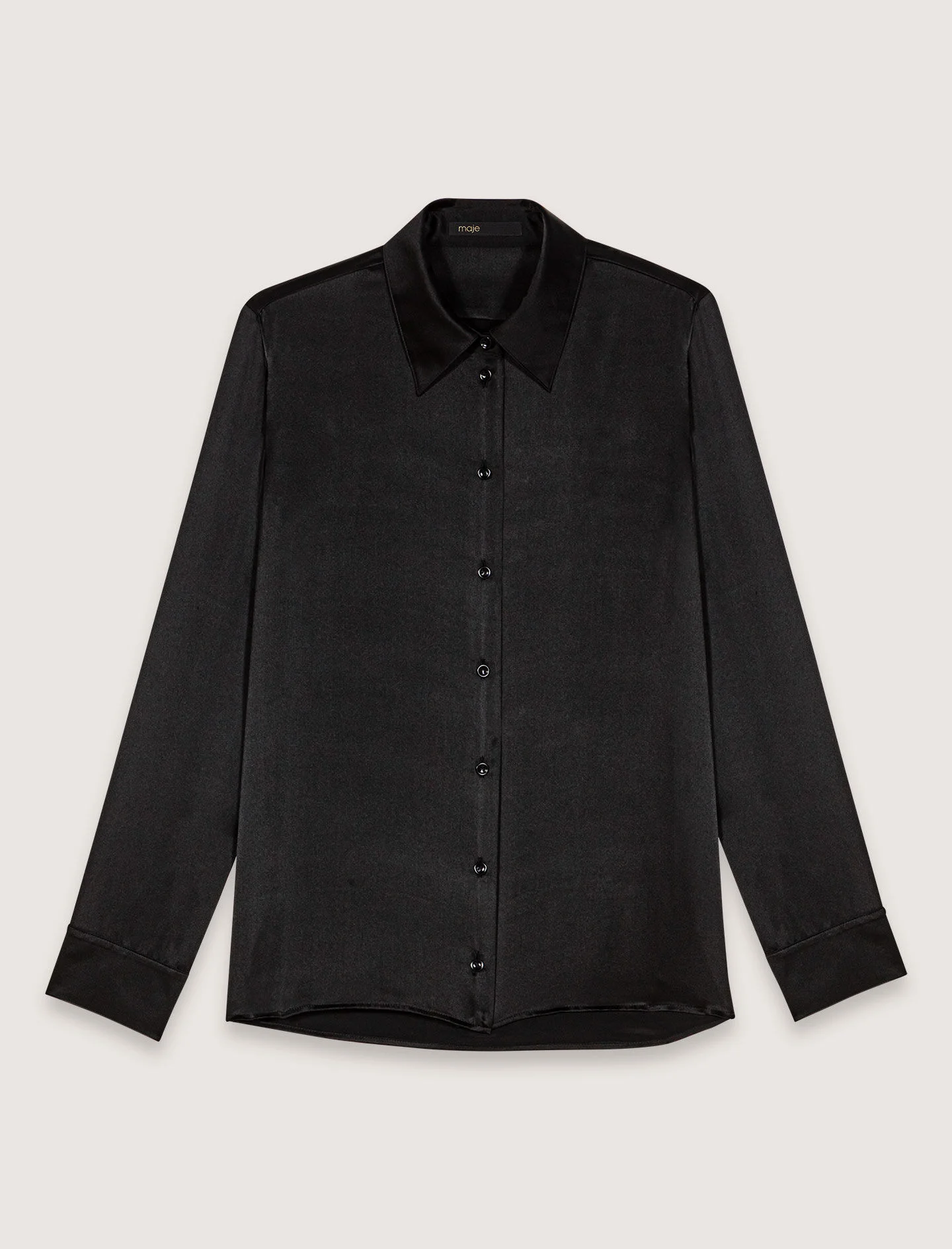 Silk shirt This shirt is made from floaty, lightweight silk in a pastel blue. It features a pointed collar as well as buttons, so you can play with how revealing you want the neckline to be. The long sleeves end in buttoned cuffs. Create a bright, eye-catching ensemble with rhinestone jeans and metallic pumps. - Floaty silk shirt - Pointed shirt collar - Button fastening - Button cuffs - Small side slits - Designed for a relaxed fit The model is 5' 10 and wears a size FR 1. Reference: MFPCM00627_2517 Composition & care Main material: 100% silk Hand wash Do not bleach Do not tumble dry Iron at a maximum temperature of 110°C without steam F - Professional dry clean, with hydrocarbon solvent, normal treatment