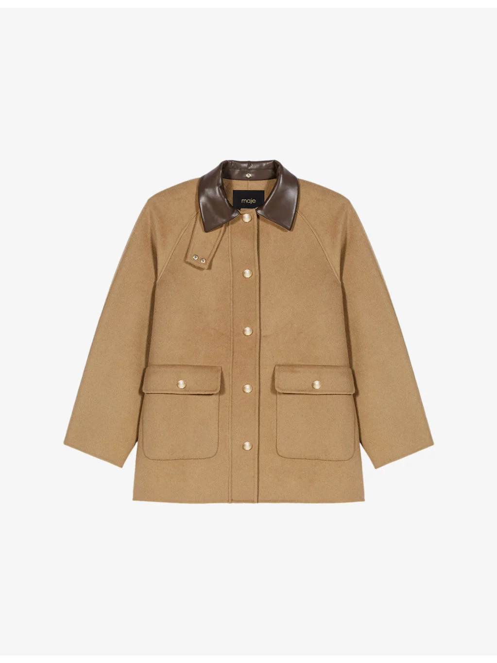 PRODUCT DETAILS - Maje wool-blend coat - 70% wool, 26% polyester, 2% polyamide, 1% viscose, 1% acrylic - Press-stud fastening - Contrasting leather-look shirt collar, removable hood in technical fabric, round gold metal press-studs, raglan sleeves and flap patch pockets, matte finish and clean edges - Dry clean - True to size - Model is 5ft 9in/1.75m and wears a size UK 8 - Midweight, non-stretch Ref: R04597465