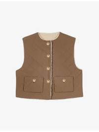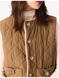 PRODUCT DETAILS - Maje puffer jacket - 100% polyamide - Exposed button fastening at front - Regular fit, round neck, sleeveless, button-down design, quilted one side, textured on the other side, two pockets - Dry clean - True to size - Model is 5ft 9in/1.75m and wears a size UK 8 - Midweight, non-stretch Ref: R04533895