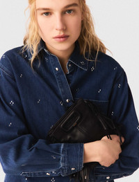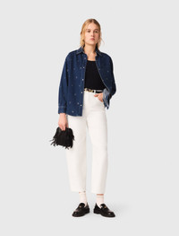 Rhinestone denim shirt Combining practicality and bright details, this denim shirt celebrates the strength and boldness of contemporary explorers. Its oversized fit and rounded hem create a full, structured look, while silver rhinestones arranged in graphic patterns brighten up the collar, body and sleeves. A subtle contrast between the raw texture of the denim, the ochre-coloured topstitching and the shine of the metallic elements reveals a modern essential. Wear it open or buttoned up as you wish, with white jeans, a black top, loafers and a matching black M mini bag. - Rhinestone-embellished 100% cotton denim shirt - All-over silver rhinestones in geometric patterns - Round metallic press-studs - Contrasting ochre-coloured topstitching - Patch chest pocket - Oversized fit, rounded hem The model is 5' 10 and wears a size FR 1. Reference: MFPCM00726_0201 Composition & care Main material: 100% cotton Regular cycle 30° Do not bleach Do not tumble dry Iron at a maximum temperature of 110°C without steam Do not dry clean