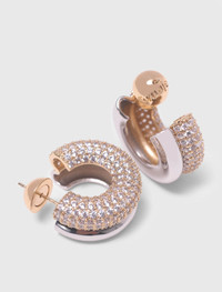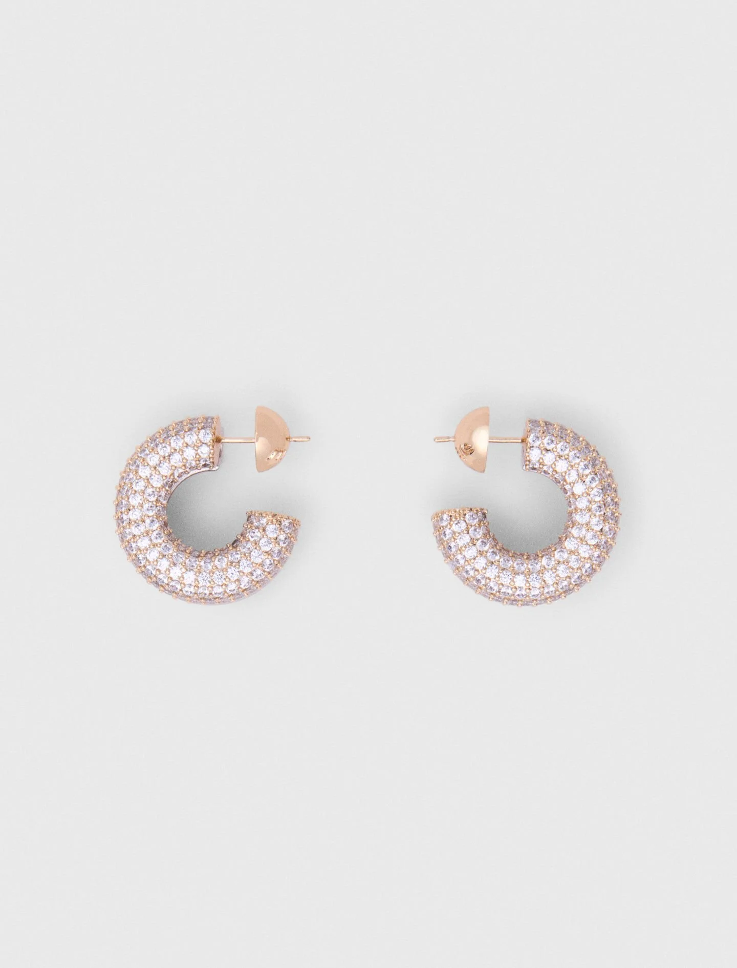 Rhinestone earrings An interplay of contrast and sparkle for this creation inspired by the Maje wardrobe, combining sophistication and character. These half-hoops feature a double ring: one fine gold-plated and fully paved with rhinestones, the other smooth, polished silver-tone, set apart by a refined openwork inner structure. Pair with a black rib knit top to highlight their contemporary, graphic appeal. - Rhinestone half-hoop style earrings - Two-tone design: fine gold-plated, set with rhinestones, and silver-tone - Openwork inner structure - Clasp engraved with maje with a clover charm Reference: MFABI01082 Composition & care Main material: 100% brass Stones: 100% zirconium oxide Do not wash Do not bleach Do not tumble dry Do not iron Do not dry clean