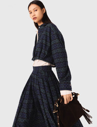 Checked rhinestone cropped shirt Maje boldly revisits classic codes, blending a tailoring spirit with dazzling details. A statement piece from this season's wardrobe, this short shirt reinterprets the classics with a bold twist. Its check print, fully adorned with rhinestones, plays with the light, and its pleated effect at the waist creates a structured, corset-inspired silhouette. The Clover buttons add a delicate signature to this assertive piece. Pair with the matching skirt for an effortlessly smart silhouette. Add leather boots and a fringed suede bag to complete the look in style. - Short rhinestone checked shirt - Signature Clover buttons - Pleated effect at the waist - Designed for a cropped, boxy fit The model is 5' 11 and wears a size 1. Reference: MFPCM00694_0299 Composition & care Main material: 100% cotton Secondary material: 100% cotton Hand wash Do not bleach Do not tumble dry Do not iron F/ - Professional dry clean, with hydrocarbon solvent, gentle treatment
