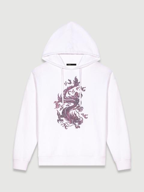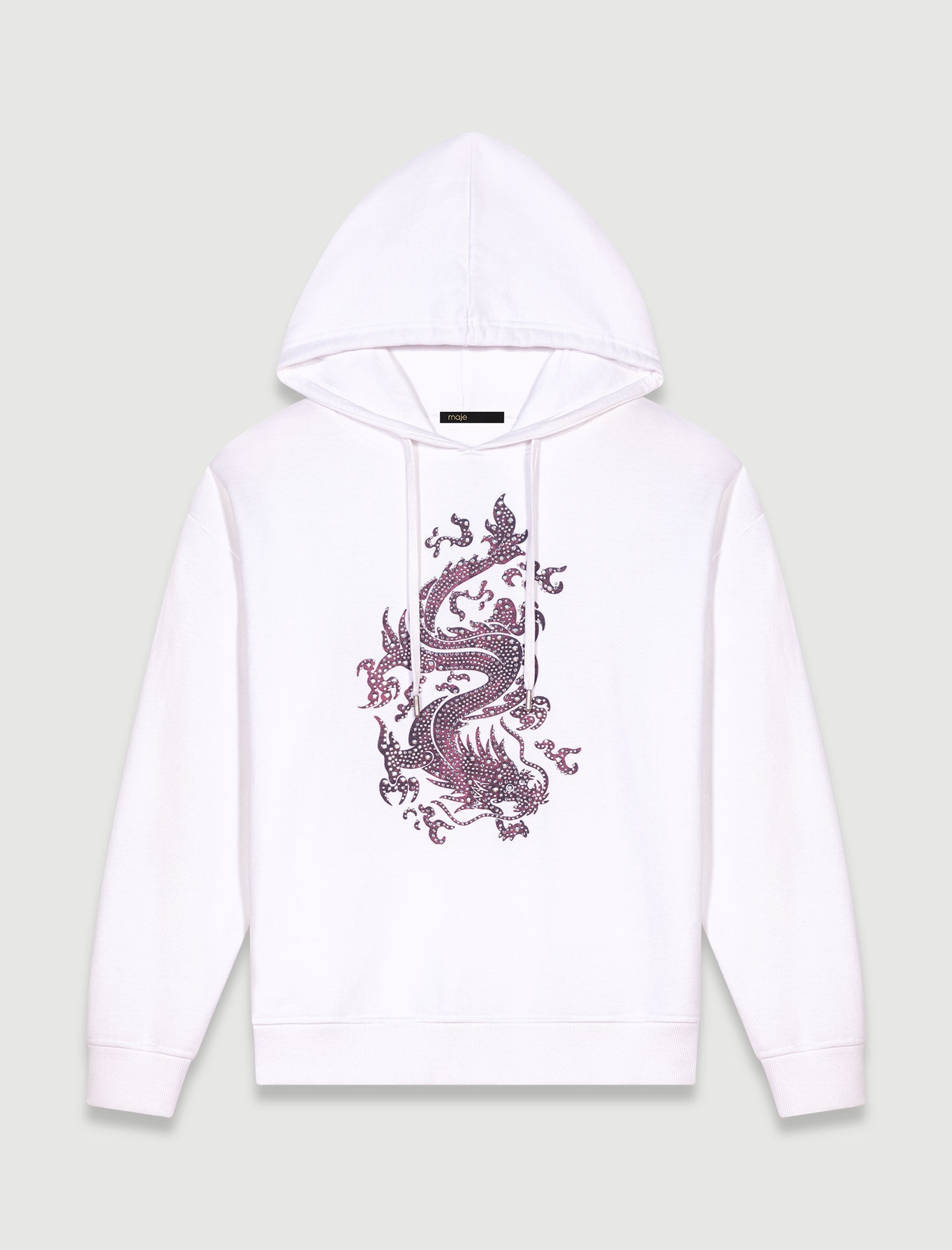 Oversized sweatshirt To celebrate Lunar New Year, the Maje studio is reinventing workplace classics and giving them a girly rock twist. Pastel shades combine with bold cutaways to create a chic, cheerful wardrobe that will make your day-to-day looks stand out. Combining comfort and boldness, this oversize, fleece-lined sweatshirt has a drawstring hood, long sleeves, ribbed hems and a front pocket. It features a dragon pattern embellished with silver rhinestones, for an elegant touch. - Oversize cotton sweatshirt - Drawstring hood - Silver rhinestone dragon pattern The model is 5' 11 and wears a size 1. Reference: MFPSW00159_10 Composition & care Main material: 100% cotton Embroidery: 100% polyester Rib: 97% cotton, 3% elastane Regular cycle 30° Do not bleach Do not tumble dry Iron at a maximum temperature of 110°C without steam Do not dry clean