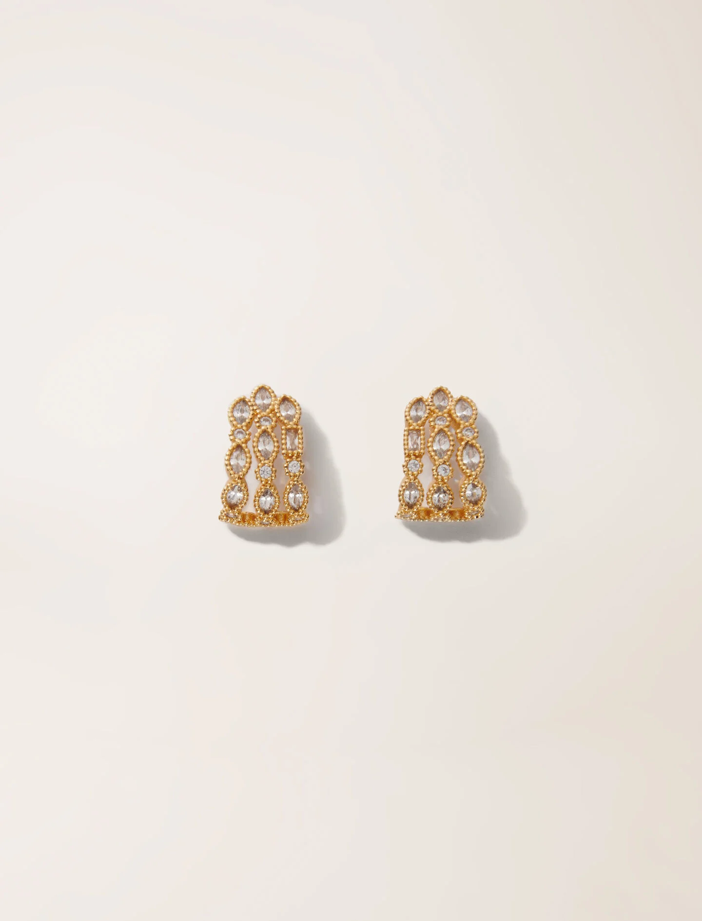 Rhinestone earrings With the release of the new collection, the studio has created iconic jewellery with a bold and sophisticated tone to elevate any outfit. These gold-plated recycled brass earrings will ensure all eyes are on you, allowing you to radiate elegance and sophistication each time you wear them. Embellished with rhinestones of various sizes, they follow the shape of the earlobe and bring plenty of sparkle. - Gold-plated recycled brass earrings - Clasp for pierced ears - Rhinestone embellishment Reference: MFABI00892 Composition & care Stones: 100% zirconium oxide Jewellery: 100% brass Do not wash Do not bleach Do not tumble dry Do not iron Do not dry clean