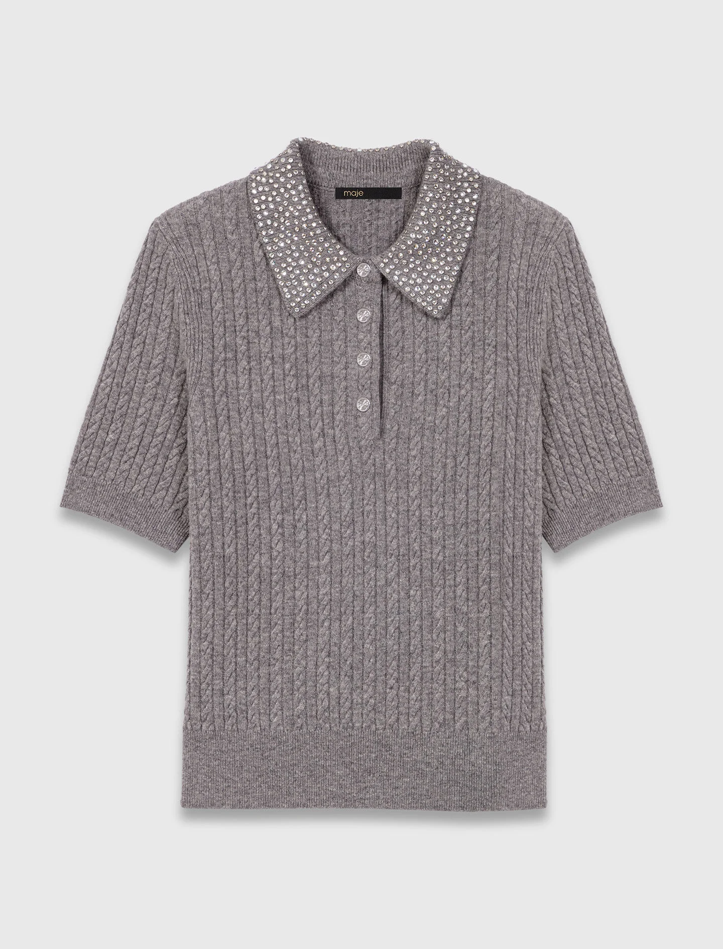 Wool polo shirt with rhinestone collar This polo shirt features an interplay of contrasts, perfectly in keeping with the chic, comforting spirit of this new collection. Knitted in a textured cable knit, it captivates with its sparkling rhinestone-embellished collar. Its straight, short cut flatters the figure perfectly. Team with faded flare jeans and flat loafers for a casual look, and complete the outfit with the matching cardigan for a head-to-toe look. - Cable-knit polo shirt - Collar embellished with set rhinestones - Button fastening - Soft, structured cable knit - Designed for a standard fit The model is 5' 10 and wears a size 1. Reference: MFPPU00932_0505 Composition & care Main material: 100% wool Collar: 89% wool, 10% polyamide, 1% elastane Rib: 89% wool, 9% polyamide, 2% elastane Hand wash Do not bleach Do not tumble dry Iron at a maximum temperature of 110°C without steam Do not dry clean