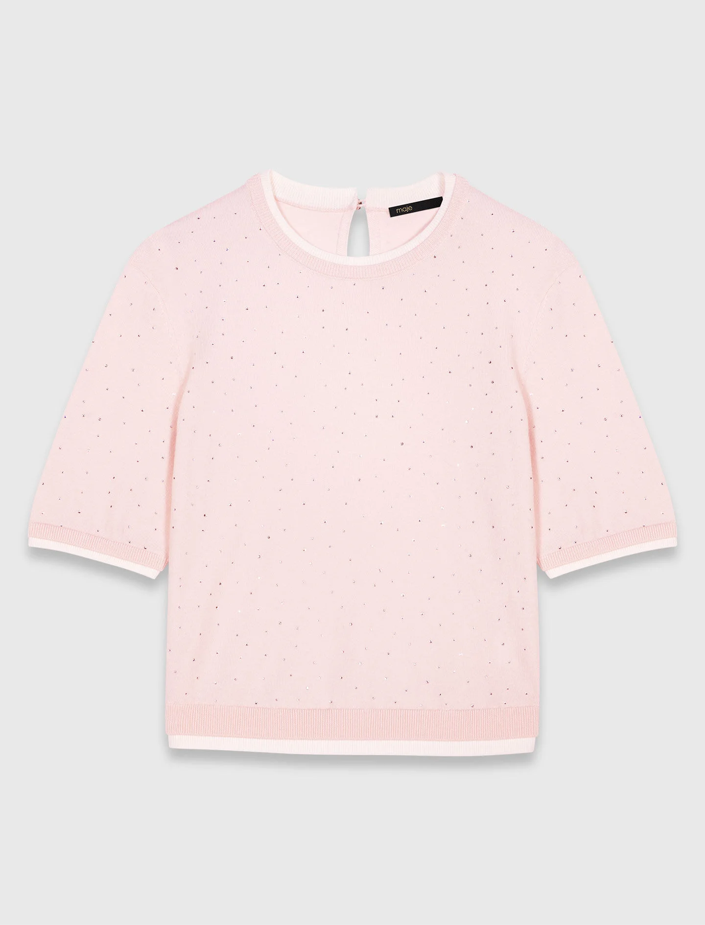 Rhinestone short-sleeve sweater A modern, energetic wardrobe ready for the transition between seasons. Maje focuses on elegance and simplicity with pieces that play with details and materials. Made from wool, this rhinestone-embellished jumper is a must-have in the collection. It features short sleeves, a round neck, and reveals contrasting trompe l'œil edges. Ideal for mid-season, it can be worn with the matching cardigan to create a twin set. Complete the look with denim bermuda shorts, chunky loafers, and knee-high socks for a look that's both casual and stylish. - Round neck knit jumper with rhinestones - Contrasting trompe l'œil edges - Short sleeves The model is 5' 10 and wears a size 1. Reference: MFPPU00916_0183 Composition & care Main material: 84% wool, 14% polyamide, 2% elastane Rib: 91% wool, 7% polyamide, 2% elastane Hand wash Do not bleach Do not tumble dry Iron at a maximum temperature of 110°C without steam Do not dry clean