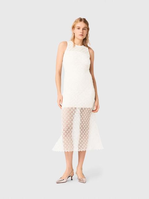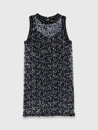 Rhinestone floral dress The collection highlights a sophisticated urban wardrobe, where every detail boldly illuminates the silhouette. This short sleeveless dress captivates with its opulent sequin embroidery, forming a dense floral pattern on a transparent tulle base that delicately reveals the upper bust. The collar and scalloped hem create a couture look, combining refined transparency with a luminous shine. For a bold, graphic silhouette, pair it with a black leather fringed bag and chunky loafers to play on the contrasting materials. - All-over floral sequin embroidered dress - Transparent tulle yoke - Round neck with sequin-trimmed collar - Short, straight cut, scalloped hem - Keyhole opening at the back - Black sequin trim on armholes and hem The model is 5' 10 and wears a size FR 36. Reference: MFPRO04629_2517 Composition & care Main material: 100% polyester Interior grosgrain: 100% cotton Removable lining: 90% polyester, 10% elastane Regular cycle 30° Do not bleach Do not tumble dry Do not iron Do not dry clean
