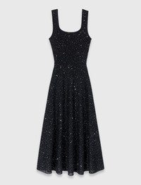 Rhinestone knit maxi dress The energy of the city inspires a dazzling, sophisticated and confident look, where every detail makes a difference. This maxi dress hugs the bust and flares out to the ankles, playing on the shine of the sequins and the subtle contrast of textures with its wide openwork band at the bottom. The square neckline and wide straps structure the silhouette. Enhance the waist with a chain belt with clover details, add an M bag and metallic pumps for a magnetic, urban look. - Flared rhinestone knit maxi dress - Fully embroidered with sparkling sequins - Wide fixed straps - Square neckline at the front and back The model is 5' 10 and wears a size FR 36. Reference: MFPRO04615_2517 Composition & care Main material: 72% polyester, 18% viscose, 6% polyamide, 4% metalized fibers Lining: 96% polyester, 4% elastane Rib: 91% viscose, 8% polyamide, 1% elastane Hand wash Do not bleach Do not tumble dry Iron at a maximum temperature of 110°C without steam Do not dry clean