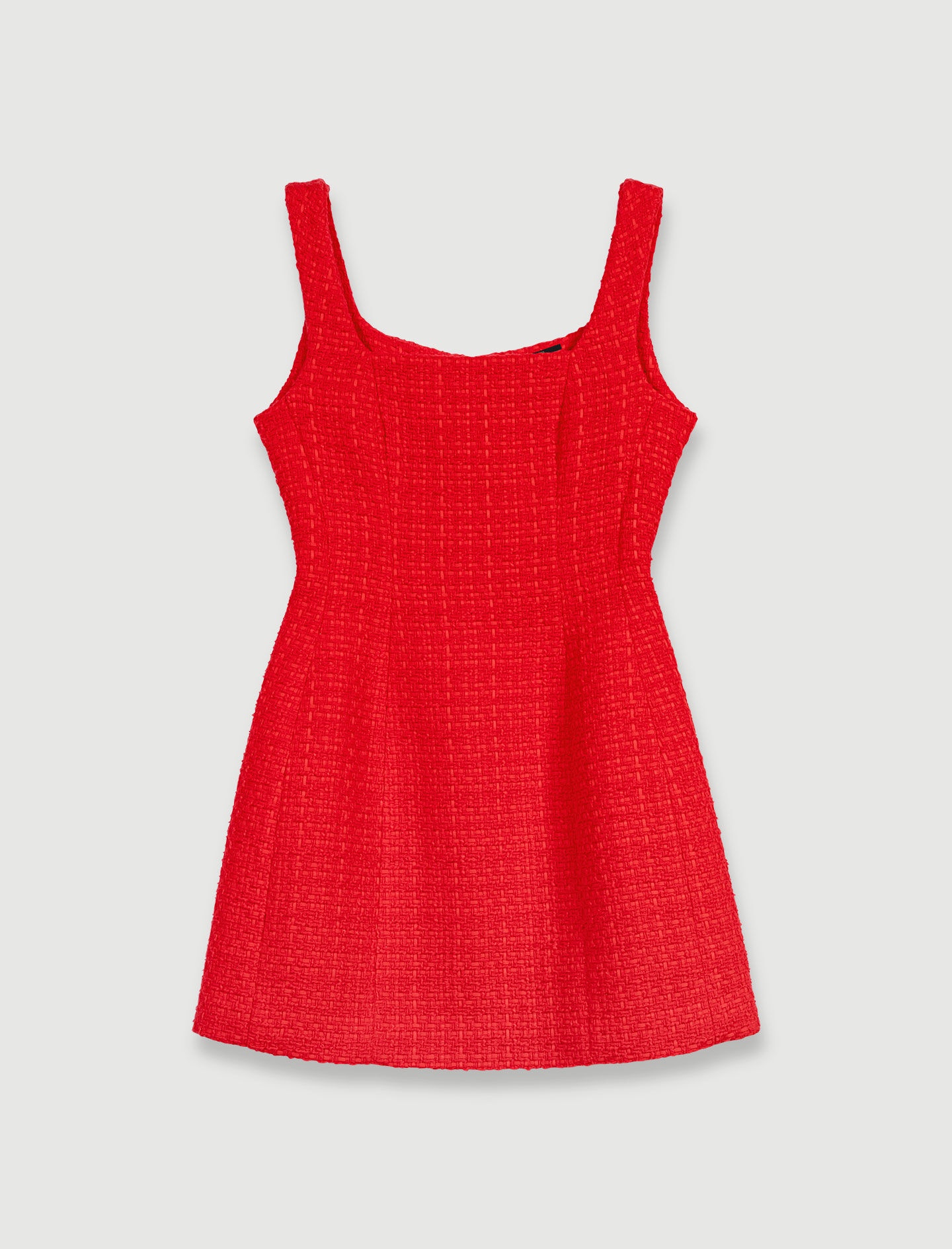Short tweed dress With bold tailoring, feminine details and vibrant shades, the Maje studio reinvents timeless pieces to create incredible day and evening wear. Featuring the season's signature colour and topstitch details, this short tweed dress creates a stylish look. With a zip fastening at the back, it has oversized straps and a square neckline. Alongside its tulip-style waist, the slightly flared skirt has a stiff, structured drape. Easy to mix and match, accessorise your outfit with a bag and platform sandals for a chic, casual look. - Square-neck dress - Slightly flared skirt - Wide straps The model is 5' 9 and wears a size 36. Reference: MFPRO03544_0515 Composition & care Main fabric: 65% cotton, 35% polyamide Lining: 100% polyester Underside fabric: 100% cotton Do not wash Do not bleach Do not tumble dry Iron at a maximum temperature of 110°C without steam F - Professional dry clean, with hydrocarbon solvent, normal treatment