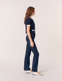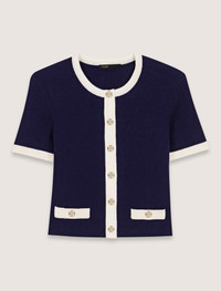 Cropped short sleeve cardigan The studio takes us to Italy, from Milan to Lake Como, for a new take on classic elegance and femininity. A dolce vita style with a touch of humour and plenty of glamour, as always. Made from rib knit, this cardigan has a snug fit, accentuated by contrasting borders. A fastening and patch pockets adorned with gold buttons add a touch of sparkle. With a round neck and short sleeves, it can be worn as a top or layered. - Cropped cardigan with contrasting details - Snug fit - Contrast trim - Gold press stud fastening - 2 patch pockets with gold buttons - Short sleeves - Designed for a slim-fit The model is 5' 9 and wears a size 1. Reference: MFPCA00586_D009 Composition & care Main material: 34% cotton, 31% viscose, 30% polyamide, 5% silk Collar: 38% cotton, 29% polyamide, 29% viscose, 4% silk Rib: 46% cotton, 32% viscose, 16% polyamide, 6% silk Hand wash Do not bleach Do not tumble dry Iron at a maximum temperature of 110°C without steam F - Professional dry clean, with hydrocarbon solvent, normal treatment
