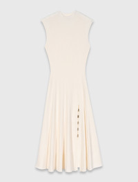 Ribbed dress with side slit A return to urban elegance: this dress revisits the preppy wardrobe with a signature touch. Its rib knit accentuates the bust and the flared pleated skirt moves with you, while the side slit, punctuated by gold AMOUR lettering, asserts a playful, modern femininity. For a sophisticated city look, create a contrast with a slim chain and leather belt, platform loafers and a large, hand-carried, dual-material tote bag. - Fitted rib knit - Flared pleated skirt - High round neck - Sleeveless - Slit adorned with gold AMOUR lettering - Midi length The model is 5' 10 and wears a size FR 36. Reference: MFPRO04551_0101 Composition & care Main material: 56% viscose, 43% polyamide, 1% elastane Hand wash Do not bleach Do not tumble dry Iron at a maximum temperature of 110°C without steam Do not dry clean