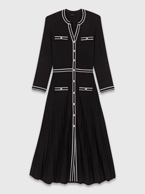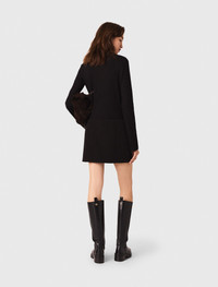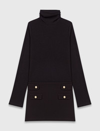 Mini turtle neck dress A masterful play on textures for a confident silhouette. This short dress combines a ribbed knit top with the structure of a tailoring-inspired skirt, adorned with button tabs. The two-piece illusion, accentuated by the contrasting materials, enhances the modernity of the piece. An enveloping turtleneck, clean finishes and a defined waist: everything is designed to elegantly accentuate the figure. Pair it with high smooth boots and a soft handbag for a confident city look. - Short 2-in-1 effect dress - Ribbed knit top, turtleneck - Structured skirt with button tabs - Zip fastening - Designed for a standard fit The model is 5' 10 and wears a size 36. Reference: MFPRO04445_2517 Composition & care Top: 74% polyester, 22% viscose, 4% elastane Bottom: 95% polyester, 5% elastane Hand wash Do not bleach Do not tumble dry Iron at a maximum temperature of 110°C without steam F/ - Professional dry clean, with hydrocarbon solvent, gentle treatment