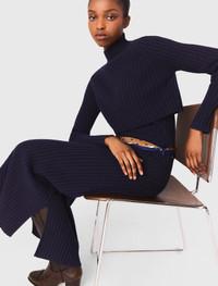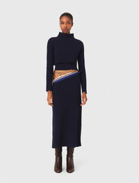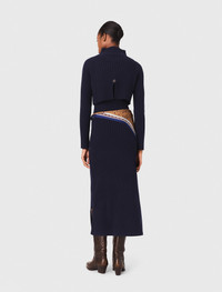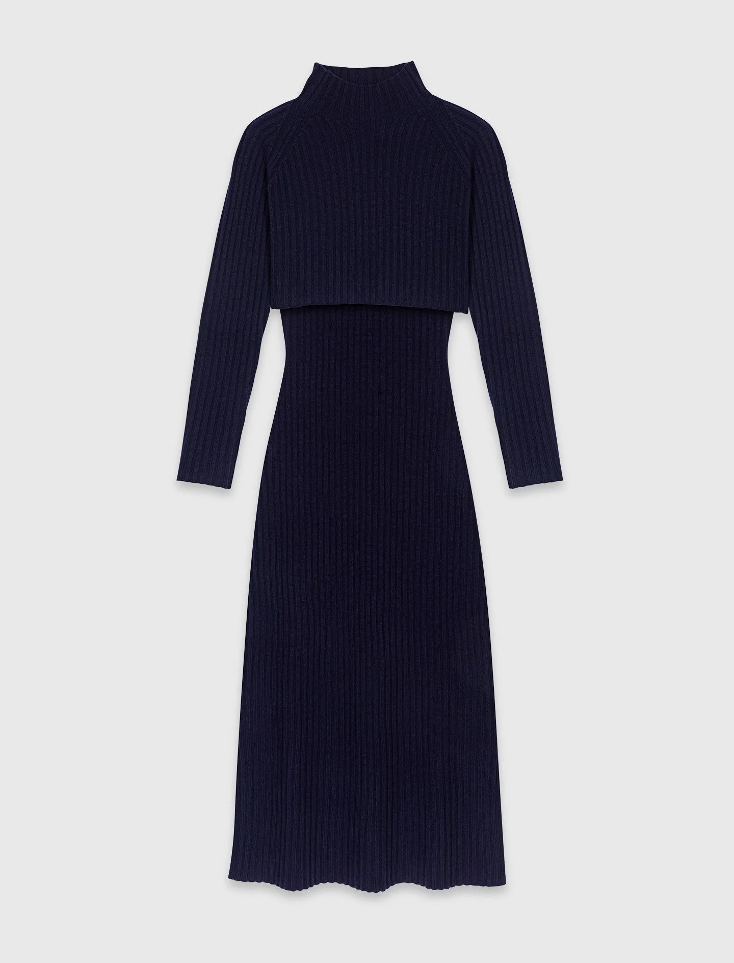 Knit maxi dress with removable sweater Lines overlap, materials subtly combine. Designed as a complete silhouette, this long dress blends the comfort of ribbed knit with the elegance of layered styling. The 2-in-1 effect creates a graphic contrast between the structured jumper and the fluid skirt. - Long ribbed knit dress - 2-in-1 effect with integrated cropped jumper - High neck and long sleeves - Sleeveless flared skirt - Designed for a standard fit The model is 5' 10 and wears a size 36. Reference: MFPRO04459_0103 Composition & care Main material: 100% wool Hand wash Do not bleach Do not tumble dry Iron at a maximum temperature of 110°C without steam F - Professional dry clean, with hydrocarbon solvent, normal treatment