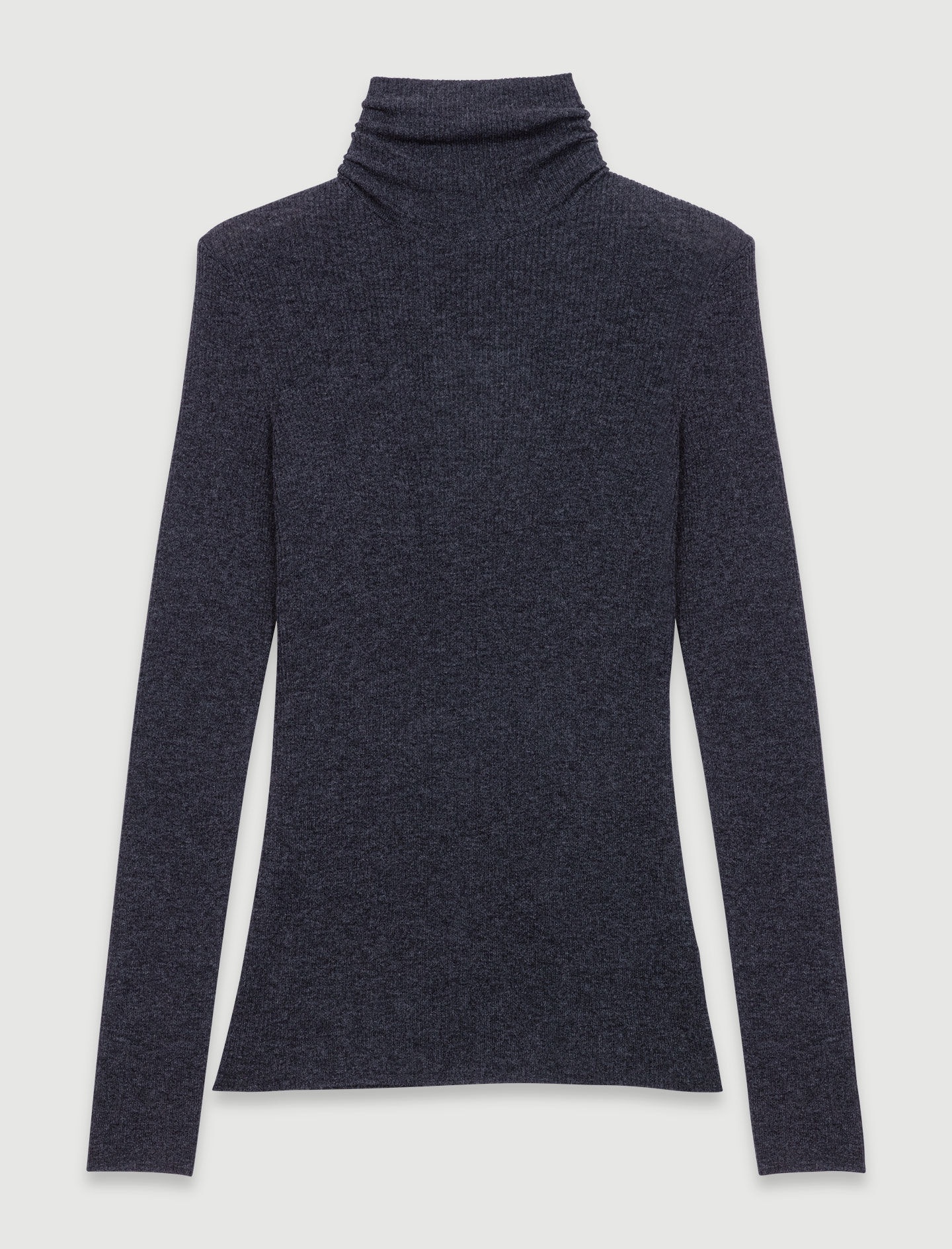 Wool and silk jumper The studio unveils its new collection, the epitome of Parisian chic. Elegance and sophistication unite in a subtle interplay of contrasts and proportions, giving your looks a confident, modern edge. Available in this season's flagship colour, this fine rib-knit jumper has a second-skin design. Featuring a turtleneck and long sleeves, it has a Clover tag on the back for sheer sophistication. Wear it on its own or layer it with a pleated skirt and loafers for a head-to-toe monochrome look. - Fine rib-knit jumper - Snug fit - Turtleneck - Long sleeves - Clover tag on back Reference: MFPPU00823_0505 Composition & care Main material: 91% wool, 9% silk Hand wash Do not bleach Do not tumble dry Iron at a maximum temperature of 110°C without steam F - Professional dry clean, with hydrocarbon solvent, normal treatment