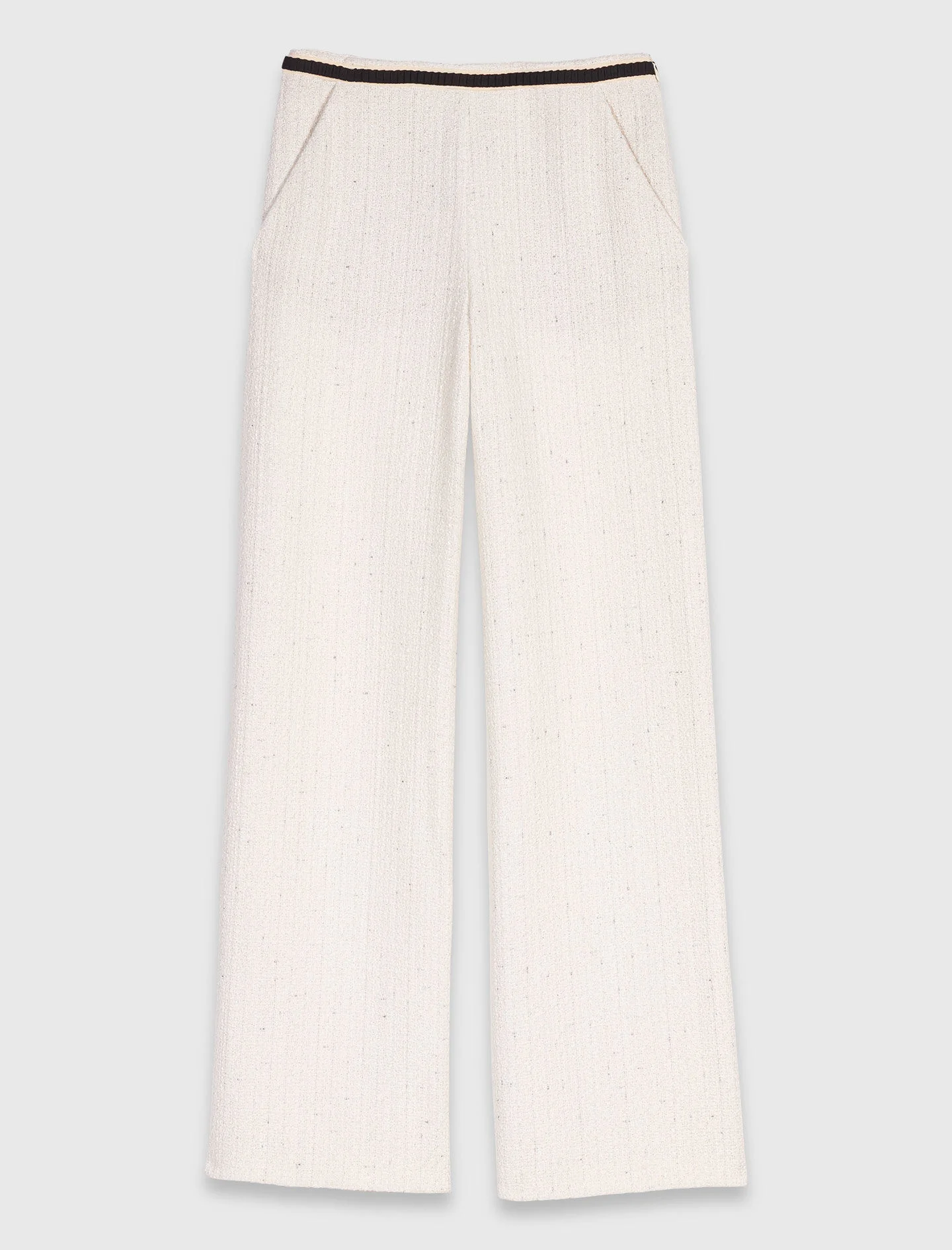 Wide leg tweed-effect trousers With this piece, Maje combines the elegance of tweed with a modern and timeless cut, perfect for a confident everyday style. Chic and stylish, these tweed-effect trousers are distinguished by their contrasting waistband. With a side zip fastening and two pockets, they have a straight cut. Wear them with the matching top to create an elegant ensemble, completed with a signature fringed bag and loafers for a look that's both modern and relaxed. - Straight-cut tweed-effect trousers - Contrasting waistband - Side zip fastening - Designed for a standard fit The model is 5' 9 and wears a size 36. Reference: MFPPA00740_0101 Composition & care Main material: 60% cotton, 20% polyester, 14% acrylic, 3% polyamide, 2% viscose, 1% metalized fibers Braid: 96% polyester, 4% elastane Pocket lining: 100% polyester Inner fabric: 100% polyester Do not wash Do not bleach Do not tumble dry Iron at a maximum temperature of 110°C without steam F/ - Professional dry clean, with hydrocarbon solvent, gentle treatment