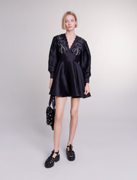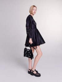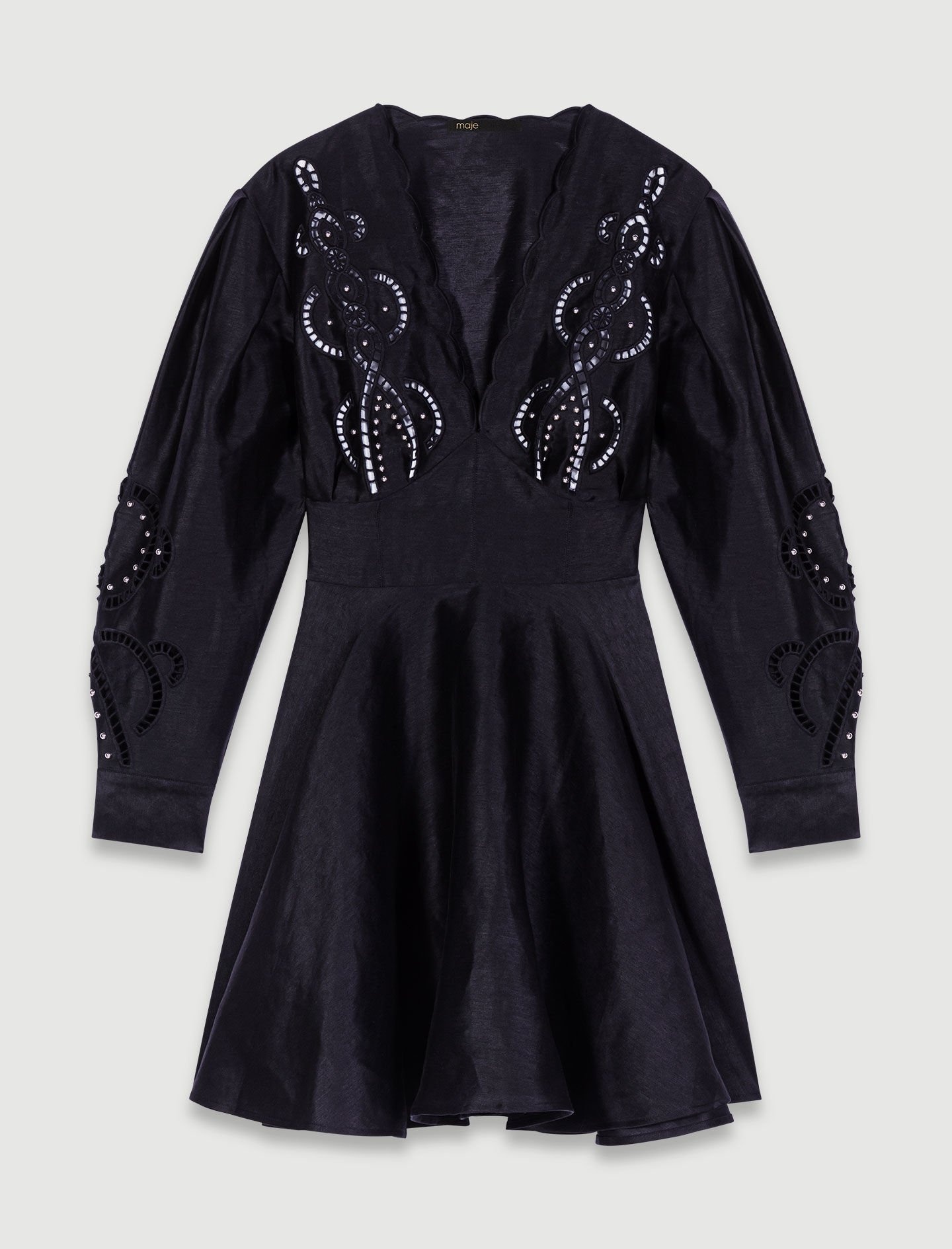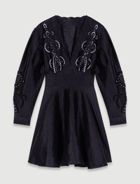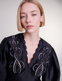Short embroidered linen dress The new Maje collection celebrates timeless elegance through iconic pieces, combining lightweight fabrics and feminine details to create an essential wardrobe. Light and elegant, this short linen dress has an interplay of volumes. Alongside long sleeves with buttoned cuffs, it features a scalloped V-neckline and a flared, ruffled skirt. Slightly fitted at the waist and smocked at the back, it appeals for its openwork embroidery accentuated with silver rivets, a bold detail to add the finishing touch to your chic look. - Short dress with openwork embroidery - Long balloon sleeves - Silver rivets The model is 5' 11 and wears a size 36. Reference: MFPRO03330_2517 Composition & care Main fabric: 92% linen, 8% polyamide Mesh: 94% polyester, 6% elastane Fusible interfacing: 100% polyester Buttons: 100% nacre Lower lining: 100% viscose Hand wash Do not bleach Do not tumble dry Iron at a maximum temperature of 110°C without steam F - Professional dry clean, with hydrocarbon solvent, normal treatment