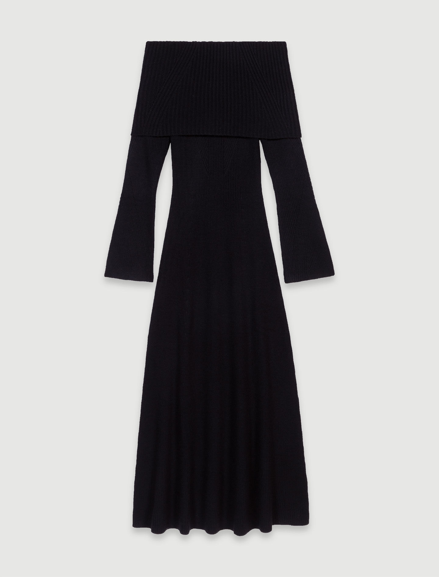 Knit maxi dress The studio unveils its new collection, the epitome of Parisian chic. Elegance and sophistication unite in a subtle interplay of contrasts and proportions, giving your looks a confident, modern edge. This rib knit maxi dress has a flattering snug design for a flattering longline fit. The long sleeves and wide XL neckline show off your bare shoulders, accentuated by the broad ribbing. Slightly flared cuffs and hem for timeless elegance. Add a touch of character to your look with accessories such as jewellery, a bag and ankle boots. - Rib knit maxi dress - Snug fit - Bardot neck - Bare shoulders with wide ribbing on neck - Flared cuffs - Slightly flared legs The model is 5' 10 and wears a size 36. Reference: MFPRO03834_2517 Composition & care Main material: 47% acrylic, 43% wool, 8% polyamide, 2% elastane Collar: 50% acrylic, 45% wool, 4% polyamide, 1% elastane Hand wash Do not bleach Do not tumble dry Iron at a maximum temperature of 110°C without steam F - Professional dry clean, with hydrocarbon solvent, normal treatment