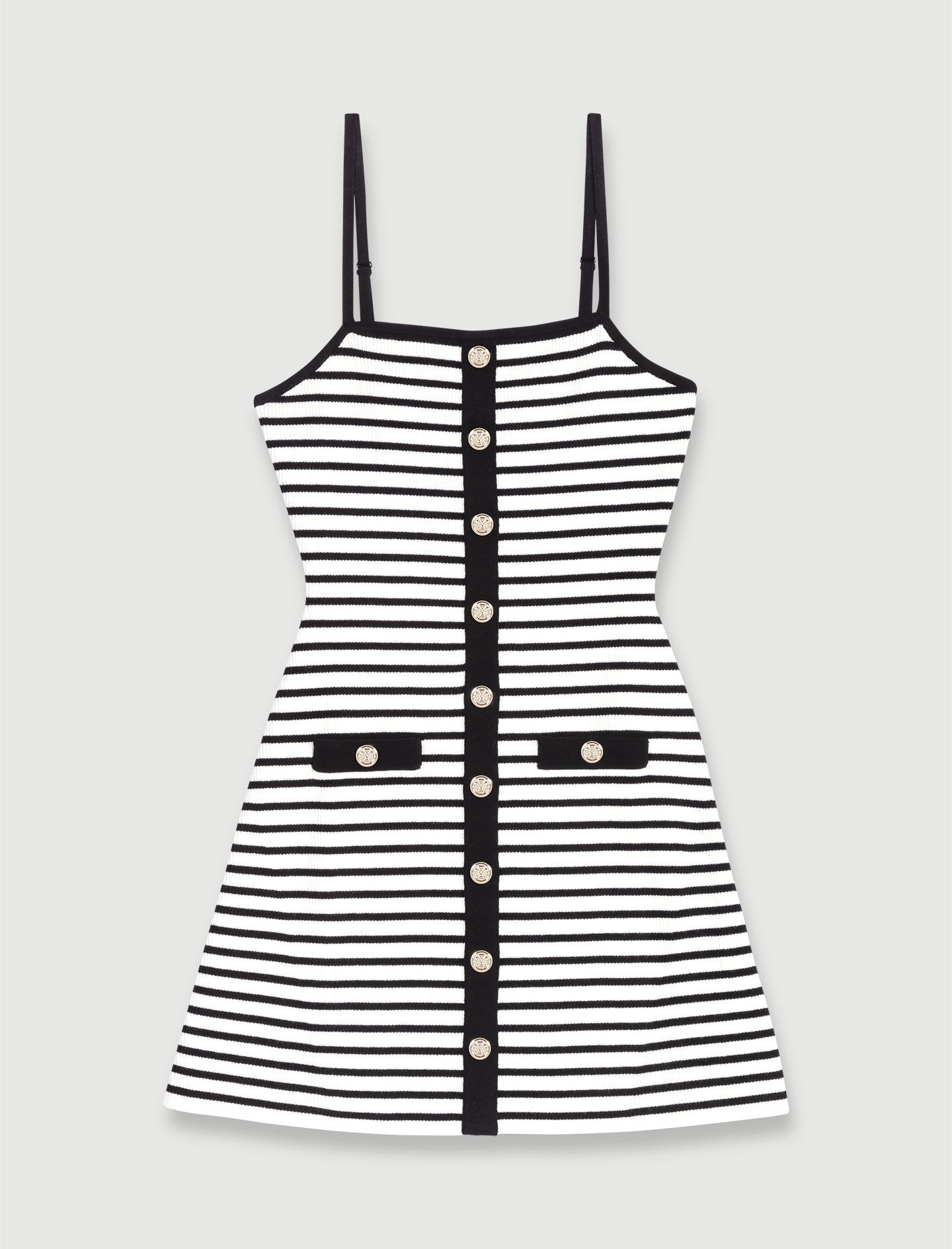 Short striped knit dress This season, the studio has conjured up a dainty, casual wardrobe where timeless pieces have been reinvented with daring tailoring and feminine details. This short stretchy rib knit dress has a second-skin effect, creating a chic, fitted silhouette. Alongside its Breton-inspired stripes, it features contrasting edges, mock buttons and two mock pockets, accentuated with Clover buttons. The adjustable spaghetti straps are removable, giving you the choice of wearing them straight or crossing over the back. Accessorise your seasonal look with a bag and platform sandals for a casual, chic look. - Stretchy rib knit short dress - Stripes - Clover button effect The model is 5' 9 and wears a size 36. Reference: MFPRO03521_O001 Composition & care Main material: 43% cotton, 32% polyamide, 23% polyester, 2% elastane Tab: 45% cotton, 31% polyamide, 22% polyester, 2% elastane Pocket: 45% cotton, 31% polyamide, 22% polyester, 2% elastane Edge: 44% cotton, 31% polyamide, 23% polyester, 2% elastane Strap: 45% cotton, 31% polyamide, 22% polyester, 2% elastane Hand wash Do not bleach Do not tumble dry Iron at a maximum temperature of 110°C without steam Do not dry clean