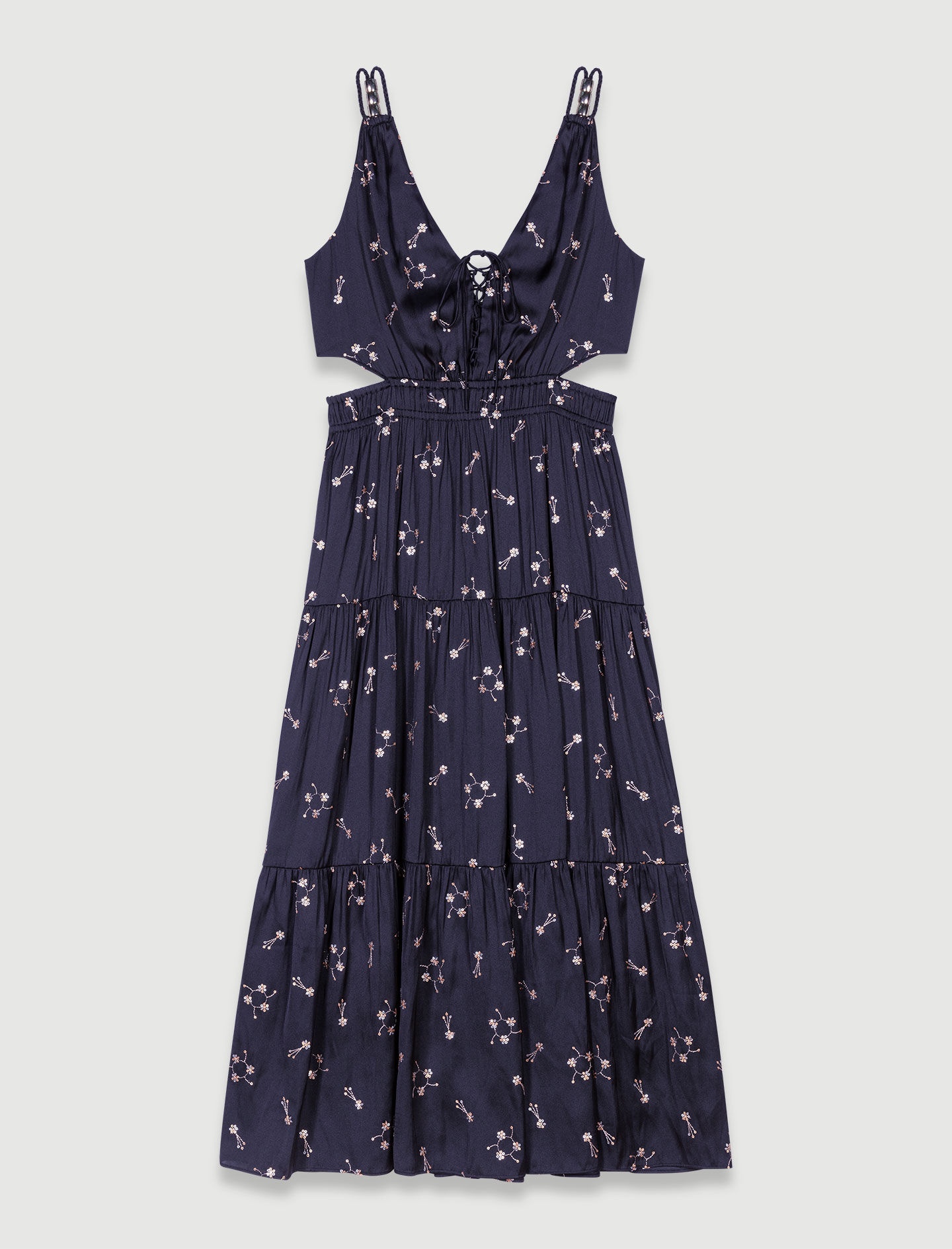 Sequin-embroidered maxi dress For the new collection, the studio mingles lightweight fabrics, interplays of contrasts and sexy details to create irresistible silhouettes. Embroidered sequin flowers make a bold statement on this long, subtly satin-effect maxi dress. Alongside braided jewellery-detail straps, it has a V-neckline embellished with beaded lacing that you can tie to suit your mood. Its smocked waistband is accentuated by daring cutaways at the sides, revealing the skin for a light, rippling chic look. - Satin-effect dress - Sequin flower embroidery - Gold beaded lacing The model is 5' 10 and wears a size 36. Reference: MFPRO03362_2517 Composition & care Main fabric: 100% polyester Sequins: 100% polyester Hand wash Do not bleach Do not tumble dry Iron at a maximum temperature of 110°C without steam F/ - Professional dry clean, with hydrocarbon solvent, gentle treatment