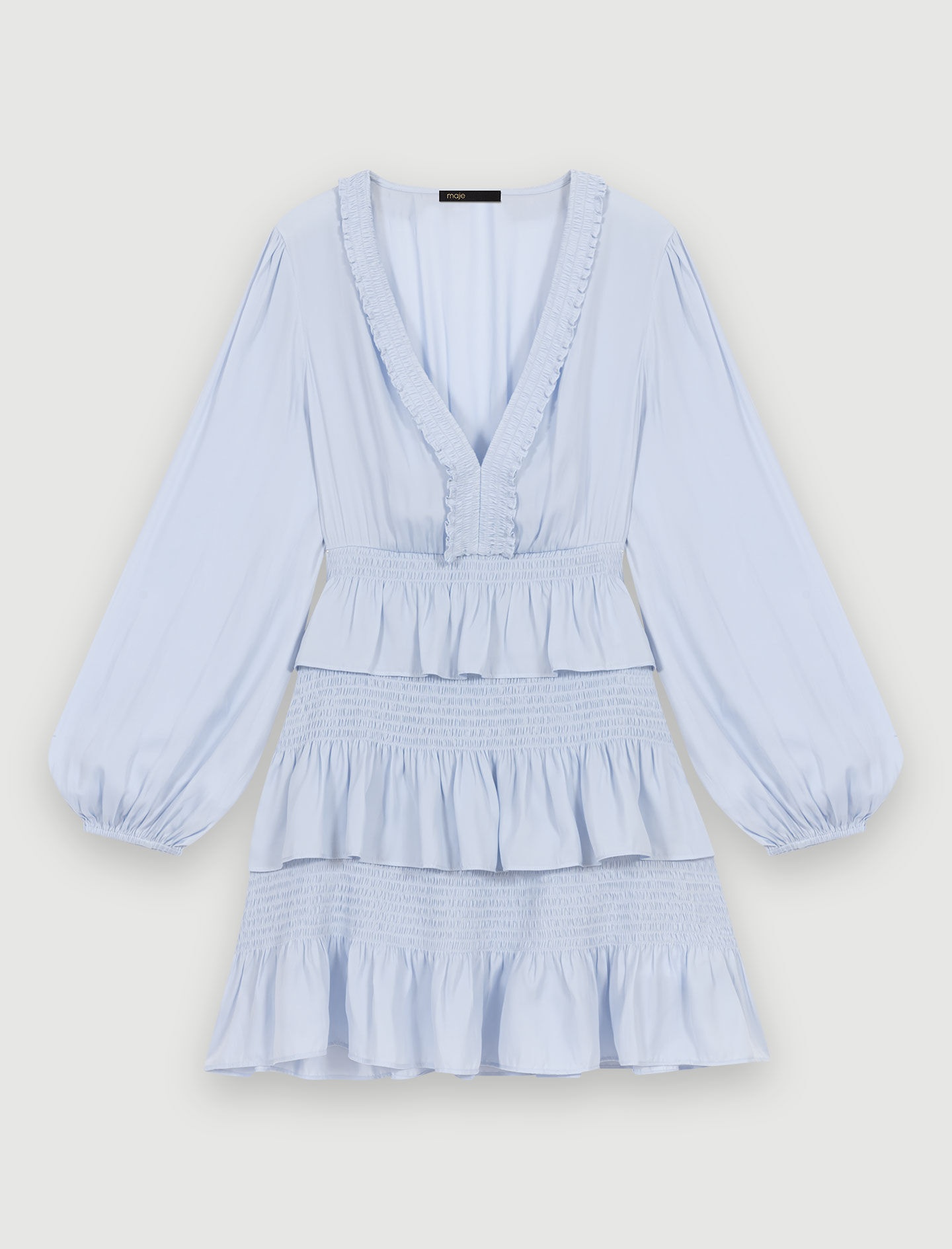 Blue ruffled dress This ruffled dress with smocks is a cool, tangy style. Its details promise an elegant look: ruffled V neckline and oversized sleeves which are tighter at the cuffs. Paired with loafers or boots, it will work for most times of day. . - Smocked dress - Ruffles - Elasticated sleeves The model is 5' 10 and wears a size 36. Reference: MFPRO02830_2507 Composition & care Main fabric: 100% polyester Regular cycle 30° Do not bleach Do not tumble dry Iron at a maximum temperature of 110°C without steam F/ - Professional dry clean, with hydrocarbon solvent, gentle treatment