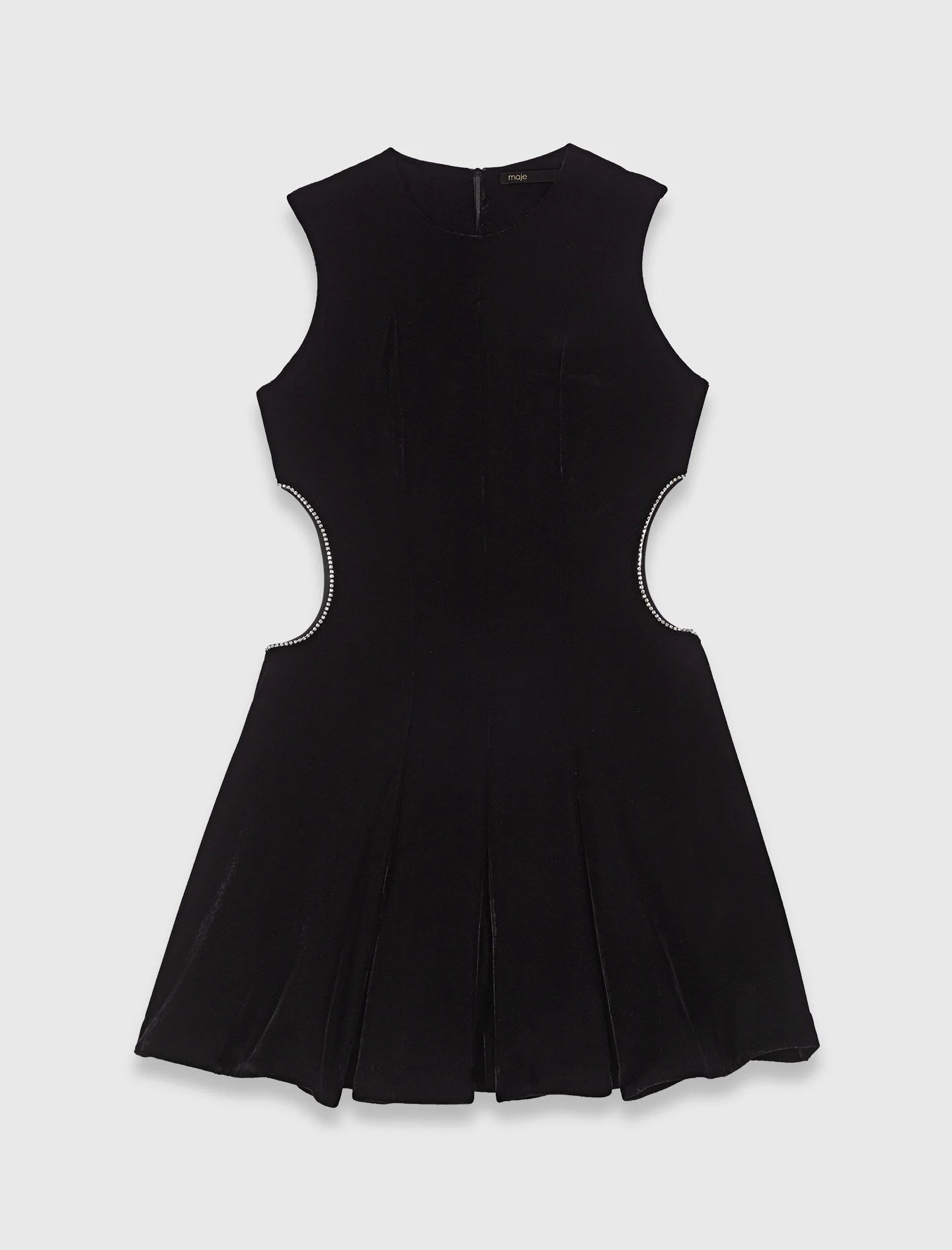 Mini velvet dress As night falls, silhouettes sparkle and take centre stage. Maje unveils pieces designed to shine after dark. This dress reinvents the festive spirit with a babydoll silhouette adorned with sparkling beads and rhinestones. The fitted top accentuates the waist before giving way to a flared skirt that catches the light with every movement. The ideal dress for an elegant, feminine look. Create a statement look by wearing it with velvet trousers, rhinestone-embellished heels and a mini fringed bag. - Short babydoll dress with rhinestones and beads - Fitted top - Flared, voluminous skirt - Zip fastening at the back - Designed for a tailored fit The model is 5' 10 and wears a size 36. Reference: MFPRO04491_2517 Composition & care Main material: 100% polyester Bias binding: 100% viscose Hand wash Do not bleach Do not tumble dry Do not iron F/ - Professional dry clean, with hydrocarbon solvent, gentle treatment