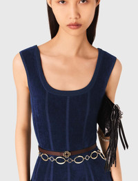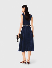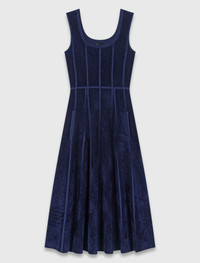 Velvet midi dress This dress fully embodies the Maje look: understated, structured elegance, always with an eye for detail. Made from velvet, its skater cut naturally accentuates the waist and elongates the silhouette thanks to its meticulous tailoring. A statement piece, designed to see you through the season in style. To accentuate the waist, play with layering belts: metal links, fine chains or discreet charms. On your feet, a pair of pointed pumps will complete this smart silhouette. - Flared velvet knit midi dress - Round neck and wide straps - Flared skirt - Designed for a standard fit The model is 5' 11 and wears a size 36. Reference: MFPRO04466_0103 Composition & care Main material: 38% viscose, 30% polyester, 28% polyamide, 3% linen, 1% elastane Neckline: 92% viscose, 8% polyamide Inlay: 90% viscose, 9% polyamide, 1% elastane Pocket lining: 90% polyester, 10% linen Rib: 88% viscose, 11% polyamide, 1% elastane Hand wash Do not bleach Do not tumble dry Iron at a maximum temperature of 110°C without steam F - Professional dry clean, with hydrocarbon solvent, normal treatment