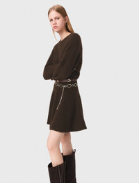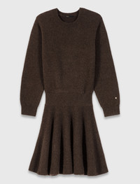 Mini yak blend dress The season highlights cosy pieces where the softness of the fabrics meets feminine tailoring. Precious knits become true everyday allies. This yak knit dress is wonderfully comfortable and naturally warm. Its fitted top with a round neck and long sleeves extends into a ribbed waist and a flared skirt. Accentuate the waist with two belts and pair with biker boots for a bold, feminine look. - Short yak knit dress - Round neck and long sleeves - Ribbed waist and flared skirt - Designed for a standard fit The model is 5' 10 and wears a size 36. Reference: MFPRO04462_0609 Composition & care Main material: 76% yak, 21% polyamide, 3% elastane Rib: 68% yak, 28% polyamide, 4% elastane Hand wash Do not bleach Do not tumble dry Iron at a maximum temperature of 110°C without steam F - Professional dry clean, with hydrocarbon solvent, normal treatment