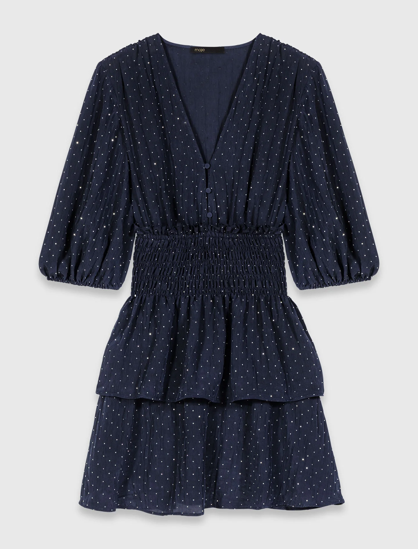 Ruffle and rhinestone dress The collection celebrates free-spirited femininity, where the power of technical details meets the confident style of a modern adventurer. This short dress is captivating with its fit-and-flare cut, pleated fabric with a matte sheen, smocked waist and floaty ruffles adorned with bright metallic rhinestones. The plunging neckline, balloon sleeves and covered buttons create a dynamic and bold silhouette. Pair it with a small Miss M mini and suede loafers to complete the look. - Dress with ruffles and rhinestones - Fully smocked waist for a perfect fit - Layered ruffles on the skirt - Silver-tone metallic rhinestones - Tone-on-tone covered buttons - Three-quarter length balloon sleeves with elasticated cuffs The model is 5' 9 and wears a size FR 36. Reference: MFPRO04636_0103 Composition & care Main material: 69% polyester, 31% polyamide Hand wash Do not bleach Do not tumble dry Iron at a maximum temperature of 110°C without steam F/ - Professional dry clean, with hydrocarbon solvent, gentle treatment