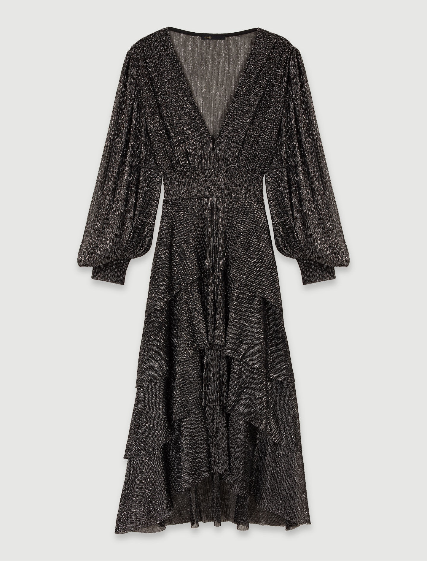 Ruffled dress A maxi dress that's sure to light up any occasion with its delicately shimmering fabric. Alongside a V-neckline and long sleeves, the smocked waist has a ruffled skirt with the perfect fit. Mix and match it with platform sandals and a clutch bag. - Long dress with metallic fibres - V-neck - Long sleeves and smocked cuffs - Smocked waist - Ruffled skirt - Lined hem Reference: MFPRO03905_B018 Composition & care Main fabric: 52% polyester, 48% metalized fibers Lining: 100% viscose Do not wash Do not bleach Do not tumble dry Do not iron F - Professional dry clean, with hydrocarbon solvent, normal treatment