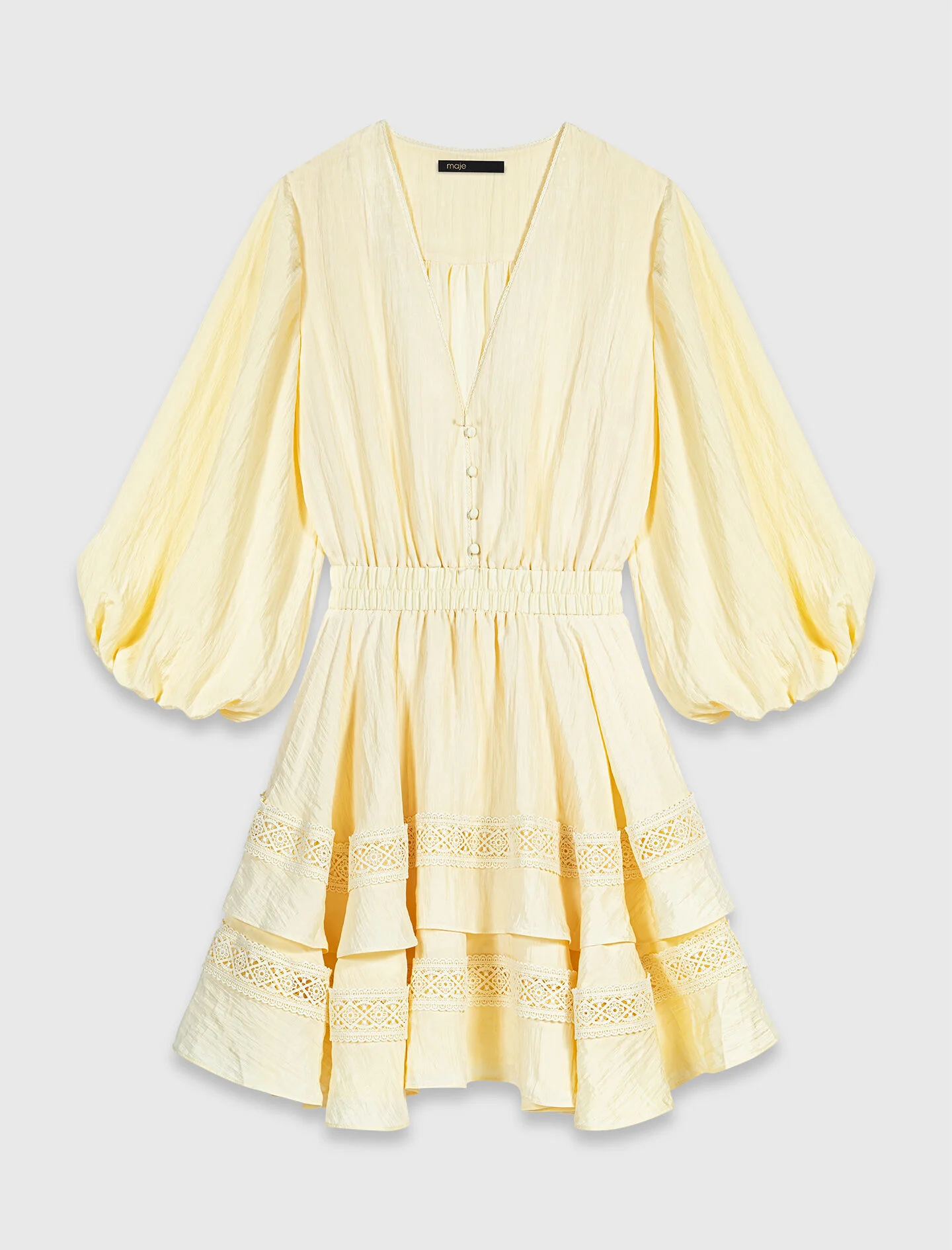 Short ruffled dress The Maje woman has a bright, contemporary and poetic look, where every detail reflects a new vision of romanticism. This short dress in pale yellow features a V-neckline accentuated by braided trim, a smocked waist to define the figure, and a full, ruffled skirt enhanced with a band of scalloped geometric lace. The puff sleeves, subtly crinkled fabric and harmony of tones create a piece that is both delicate and modern. - Short ruffled dress with inset lace - Smocked waist and flared A-line skirt - Long puff sleeves with elasticated cuffs - Deep V-neckline edged with braided trim - Tone-on-tone covered buttons - Scalloped detailing on the lace Reference: MFPRO04635_0259 Composition & care Main material: 71% polyester, 29% polyamide Braid: 100% polyester Hand wash Do not bleach Do not tumble dry Iron at a maximum temperature of 110°C without steam F/ - Professional dry clean, with hydrocarbon solvent, gentle treatment