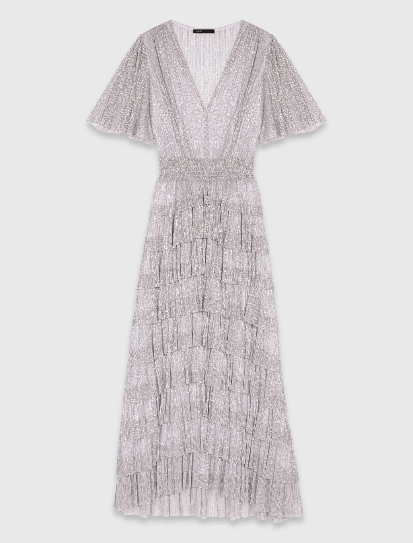 Metallic ruffled midi dress Designed for sunny days and celebratory evenings, the collection combines iridescent materials and airy cuts. This long, delicately shimmering lurex dress offers a stylish silhouette. An iconic piece from the Maje collection, revisited each season, it features a crossover neckline, a smocked waist, and panels that flow with movement. Wear with delicate sandals and a signature bag for an elegant and timeless silhouette. - Long lame ruffled dress - V-neck and short sleeves - Smocked waist for a structured fit - Designed for a standard fit The model is 5' 9 and wears a size 36. Reference: MFPRO04326_0500 Composition & care Main material: 57% polyester, 43% metalized fibers Lining: 100% viscose Do not wash Do not bleach Do not tumble dry Do not iron F - Professional dry clean, with hydrocarbon solvent, normal treatment