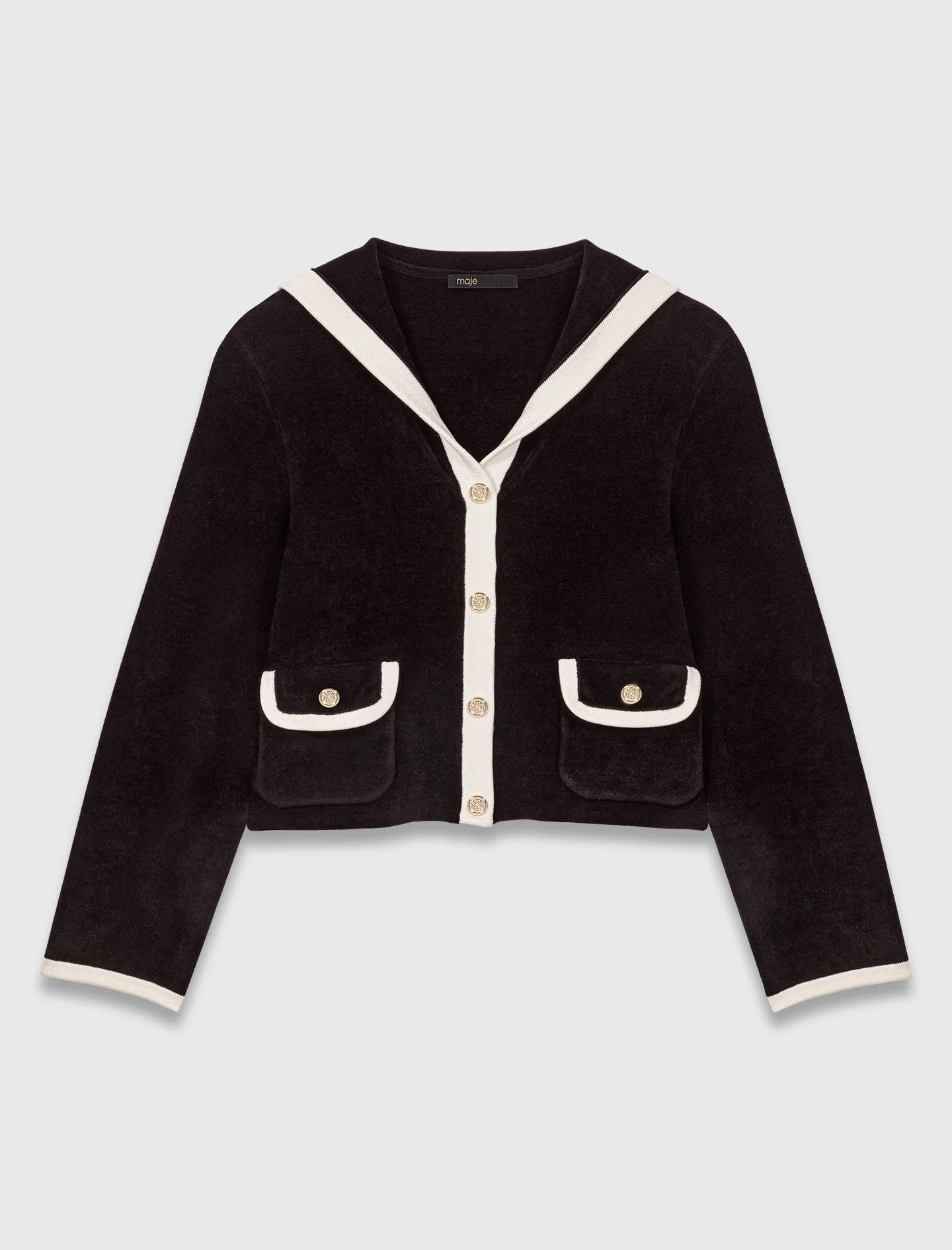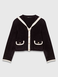 Velvet-effect cardigan This season, an interplay of textures takes centre stage and the collection's statement pieces create an assertive silhouette. Made from a soft, textured velvet-effect knit, this cropped cardigan stands out with its wide sailor collar inspired by nautical style and its contrasting finishes. Easy to mix and match, complete the look with faded jeans and timeless accessories like boots and a leather bag. - Cropped velvet-effect knit cardigan with contrasting trim - Sailor collar and long sleeves - Button fastening The model is 5' 11 and wears a size 1. Reference: MFPCA00660_2517 Composition & care Main material: 53% viscose, 45% polyamide, 2% elastane Rib: 94% viscose, 5% polyamide, 1% elastane Hand wash Do not bleach Do not tumble dry Iron at a maximum temperature of 110°C without steam F - Professional dry clean, with hydrocarbon solvent, normal treatment