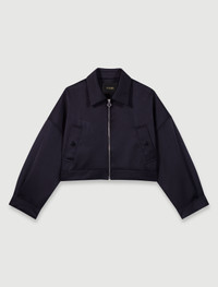 Satin jacket An ode to versatility, the new Maje collection uses comforting fabrics and timeless colours to make your daywear and evening wear look simply sublime. Crafted in a satin-finish technical fabric, this cropped jacket creates a structured silhouette with an impeccable fit. Featuring a shirt collar, long sleeves and buttoned cuffs, it has a zip fastening with a Clover pull tab and two press-stud pockets. Both chic and casual, it goes well with a shirt, skirt and loafers. - Cropped jacket with pockets - Zip with Clover zip pull tab - Long sleeves and buttoned cuffs - 2 slanted pockets with press studs The model is 5' 10 and wears a size 36. Reference: MFPBL00732_2517 Composition & care Main fabric: 98% polyester, 2% elastane Lining: 100% viscose Do not wash Do not bleach Do not tumble dry Do not iron F - Professional dry clean, with hydrocarbon solvent, normal treatment