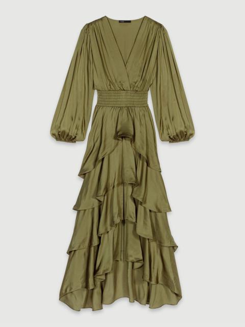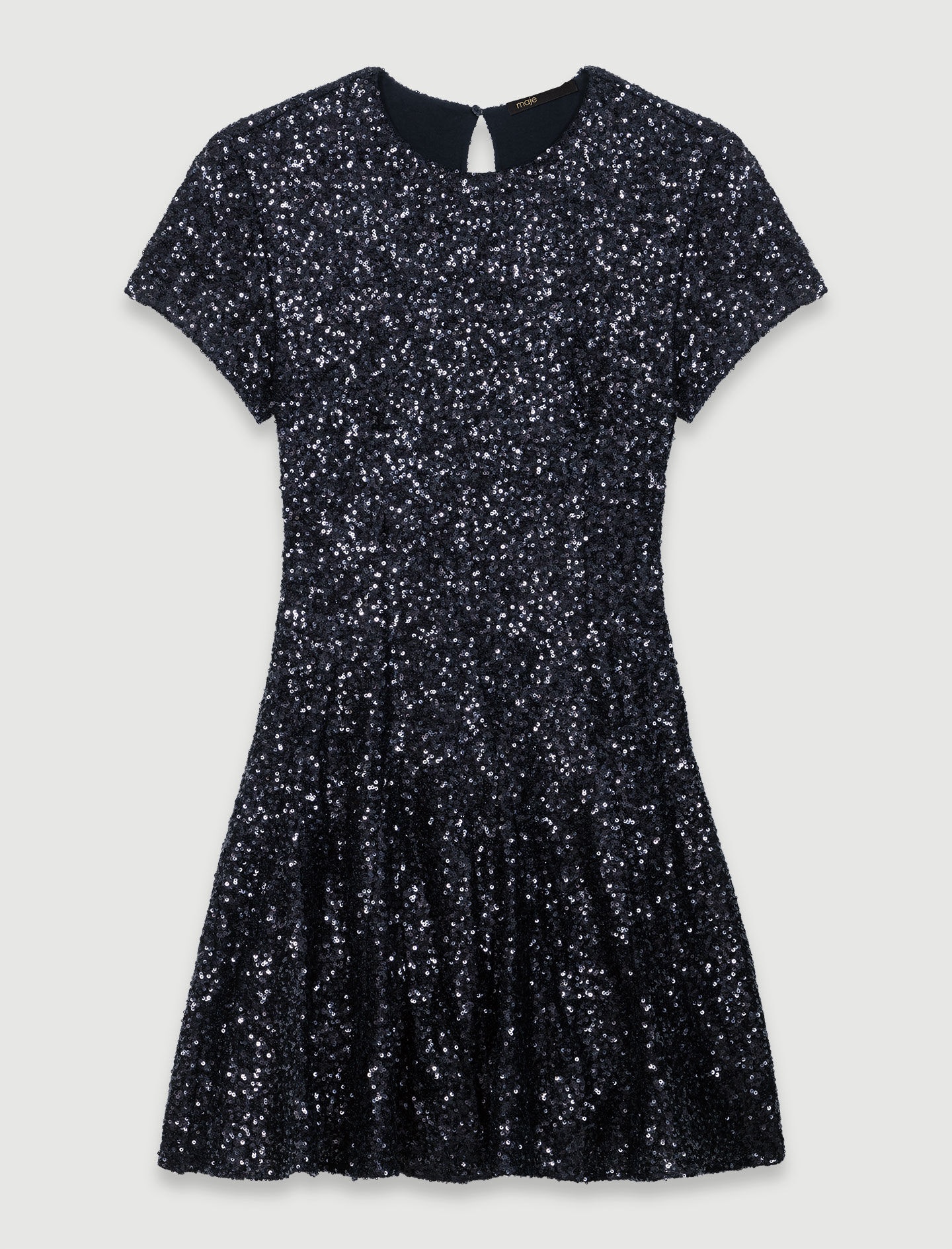 Short sequin dress This winter, the studio has created an ode to timeless Parisian elegance. From preppy everyday wear to glittering evening events, the new collection is all about sophistication and boldness, in a subtle interplay of colours and cuts. Shine in style with this short, lined dress with all-over sequins. A round neck, short sleeves and a buttoned teardrop opening at the back create an irresistible silhouette, complemented by a flared skirt. This great all-rounder can be accessorised with platform sandals and jewellery. - Short dress - All-over sequins - Round neck - Short sleeves - Buttoned teardrop opening at back - Flared skirt - Lined The model is 5' 11 and wears a size 36. Reference: MFPRO03761_2517 Composition & care Main material: 95% polyester, 5% elastane Lining: 100% viscose Sequins: 100% polyester Hand wash Do not bleach Do not tumble dry Do not iron Do not dry clean