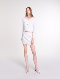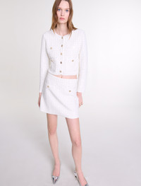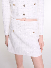 Short sequinned knit skirt An ode to winter elegance, in dazzling white. This capsule captures the light to transform silhouettes from glamorous to casual chic. This short warp knit skirt with all-over sequins sparkles with every move. The slightly flared fit is accentuated by two welt pockets with gold buttons. Go for a head-to-toe outfit with a coordinating jacket, pumps and jewellery. - Short slightly flared warp knit skirt - Transparent sequins - 2 welt pockets with buttons - Side zip fastening - Elasticated waist The model is 6' 0 and wears a size 36. Reference: MFPJU01356_0006 Composition & care Main material: 43% viscose, 19% cotton, 19% polyamide, 16% polyester, 2% metalized fibers, 1% elastane Pocket: 51% viscose, 21% polyester, 14% polyamide, 12% cotton, 1% metalized fibers, 1% elastane Waistband: 46% viscose, 19% polyamide, 17% polyester, 15% cotton, 2% elastane, 1% metalized fibers Hand wash Do not bleach Do not tumble dry Iron at a maximum temperature of 110°C without steam Do not dry clean