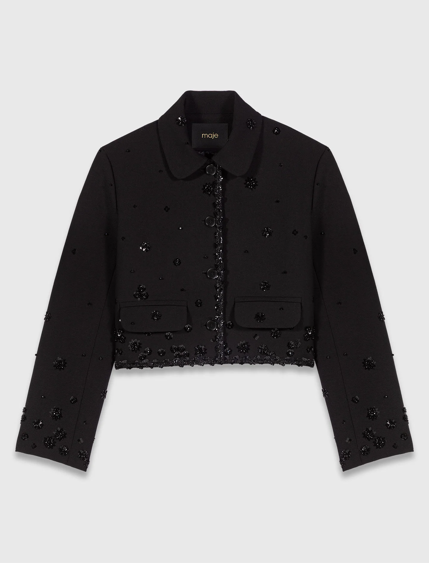 Short embroidered jacket As night falls, silhouettes shimmer and make a statement. Maje reveals pieces designed to shine after dark. This short jacket makes a statement with its sequin embroidery that forms luminous flowers. The contrast between the tailored cut and the exquisite details gives it a bold character. Worn with the matching skirt, it creates a dazzling outfit, perfect for letting your silhouette shine in a festive atmosphere. - Short jacket with floral sequin embroidery - Long sleeves and front button fastening - Two pockets with rounded flaps - Satin lining - Designed for a standard fit The model is 5' 10 and wears a size 36. Reference: MFPVE00745_2517 Composition & care Main material: 86% polyester, 10% viscose, 4% elastane Lining: 53% polyester, 47% viscose Sequins: 100% polyester Hand wash Do not bleach Do not tumble dry Iron at a maximum temperature of 110°C without steam Do not dry clean